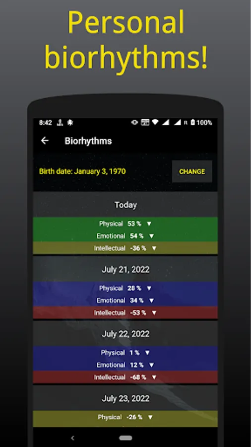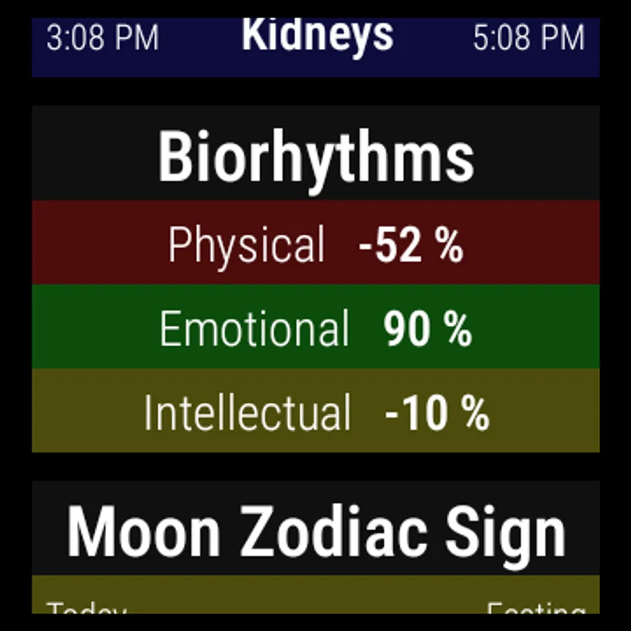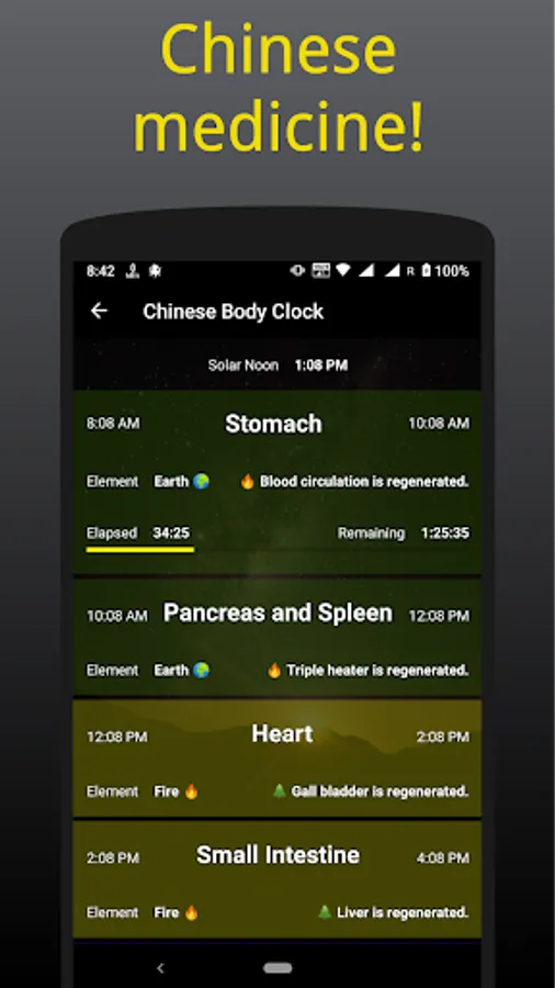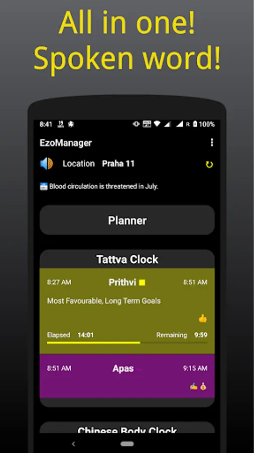 All major influences in one app: 📊 Personal biorhythms. 🌛 Lunar calendar. 🌅 Tattva clock. ☯ Chinese body clock. 🌞 Sun zodiac sign. 🌍 Solstices and equinoxes. 💙 Threatened organs.