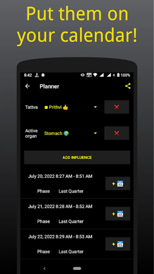 Discover planning secrets of people from different cultures around the world in this app. Combine favorable influences and find out suitable dates and times in a few seconds. Share them and add them to your calendar.