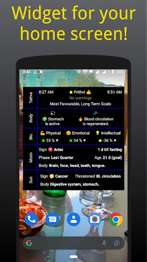 Be constantly informed about the influence of the Moon, the current tattva in your locality, the active and resting organ according to the Chinese organ clock, your current biorhythms or the influence of the Sun using a mobile application or widget.