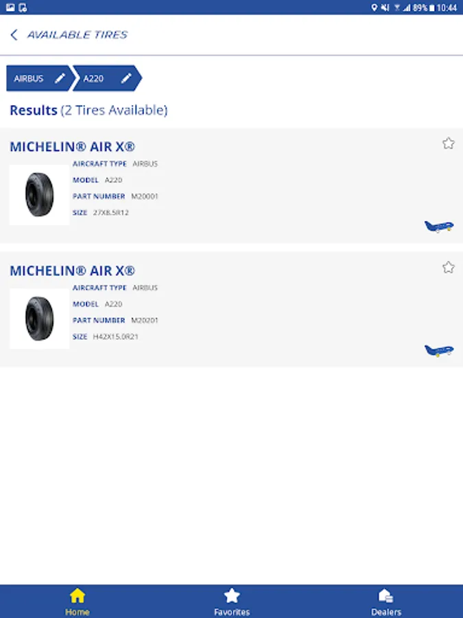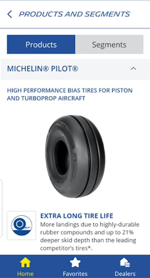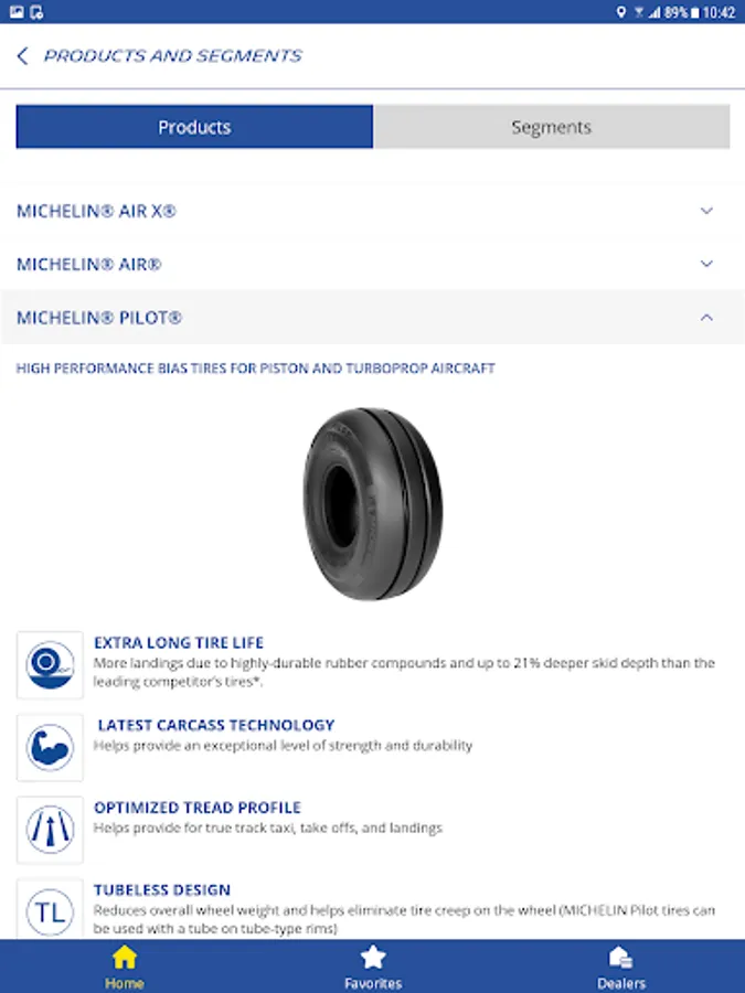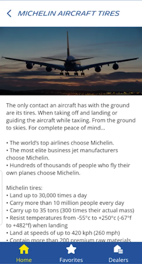 The app also provides information about Michelin aircraft tires and tubes. It includes a Fitment Guide for determining the correct Michelin products that are approved for each specific airframe. A Tire Wear Guide includes photographs and descriptions of the most common wear conditions for help in troubleshooting.