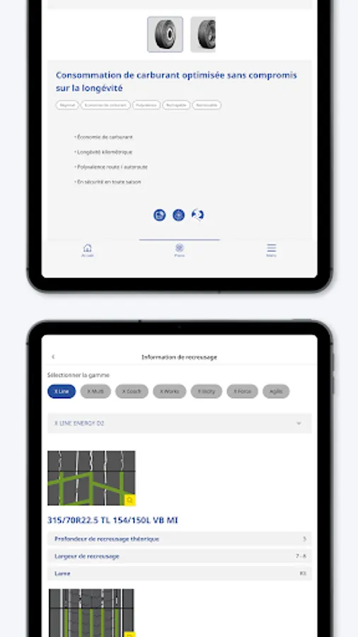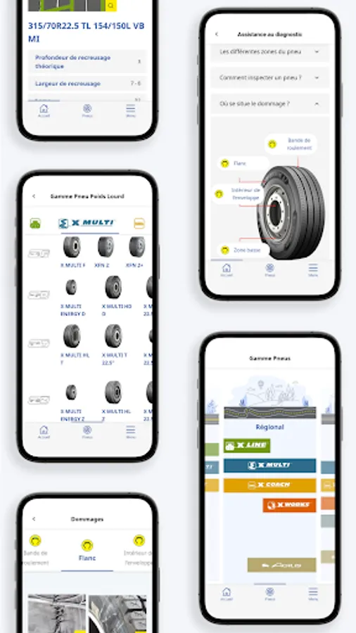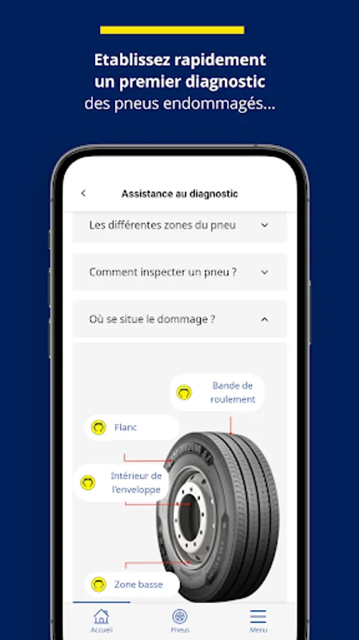 support to tire professionals finding information about Michelin tires and their usage, inflation pressure recommendations, technical characteristics, regrooving information, first diagnosis on a damaged tire