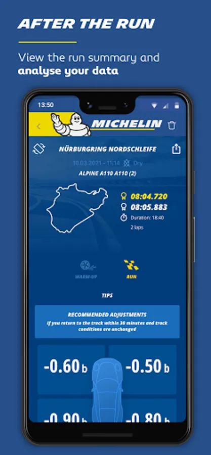 - Before the run, the app gives you advice on the best pressures for your vehicle and your conditions of use: on road or circuit and in dry, wet or damp conditions
