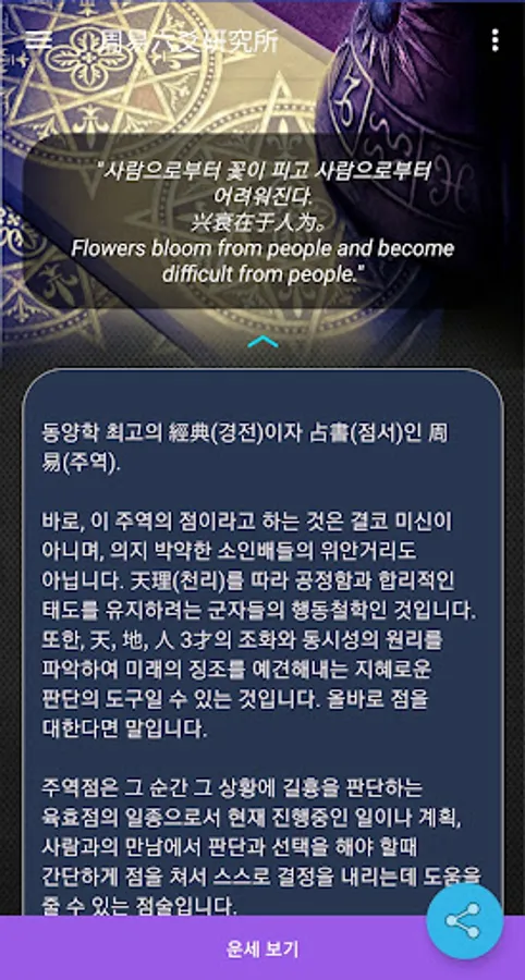 In addition, it can be a wise judgment tool to foresee signs of the future by grasping the principle of harmony and synchronicity among the three powers of heaven, earth, and human. That is, if you do it right.