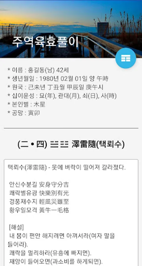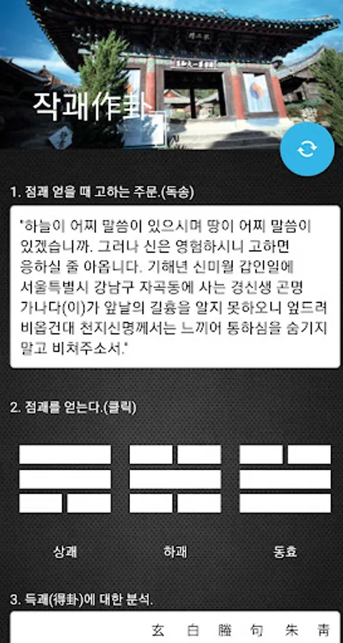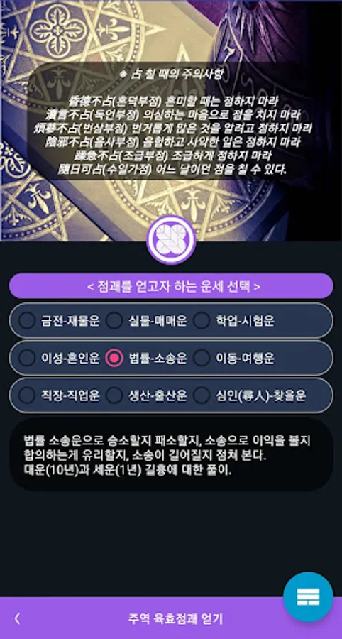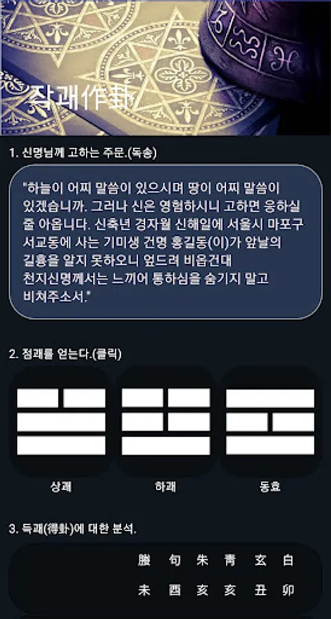 Judging good and bad, success and failure, gain and loss for the problem at hand through the code with highly connotative meanings of 64 trigrams and 384 filial piety is the leading role of the six virtuous points. is the secret. If you deal with the secret of the yukhyojeom with the right attitude, you will have a new perspective on the problem you are facing and you will probably seek the answer yourself.