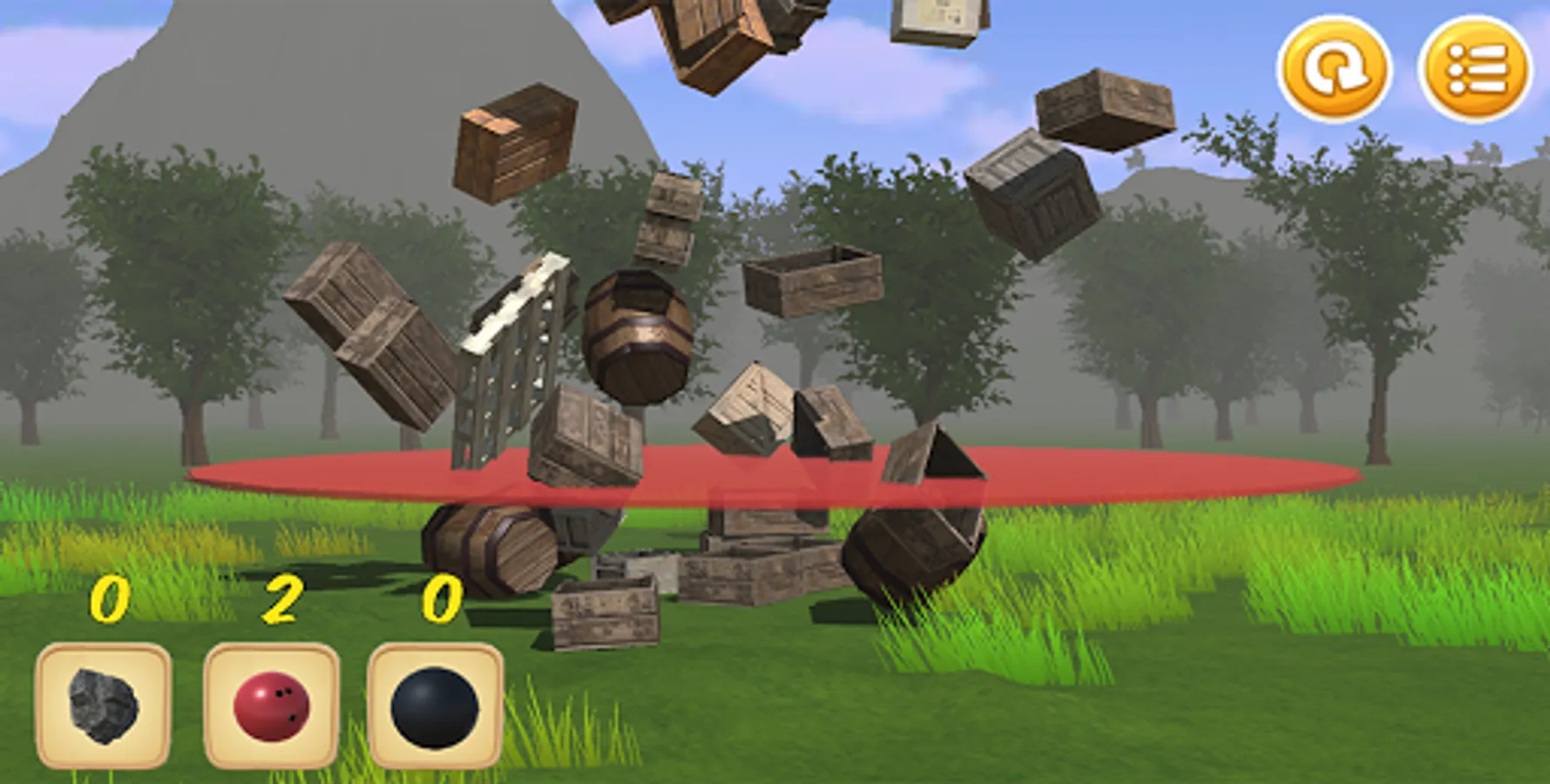 Boxes, crates, pallets, barrels in different configurations. Shoot with rocks or bowlingballs. You can try as often as you like. If you don't succeed, try different angles of attack or different heights. Hitting an object on its corner often has a bigger effect.