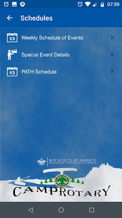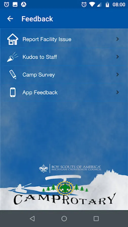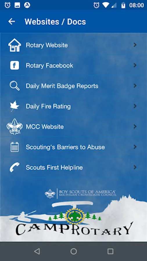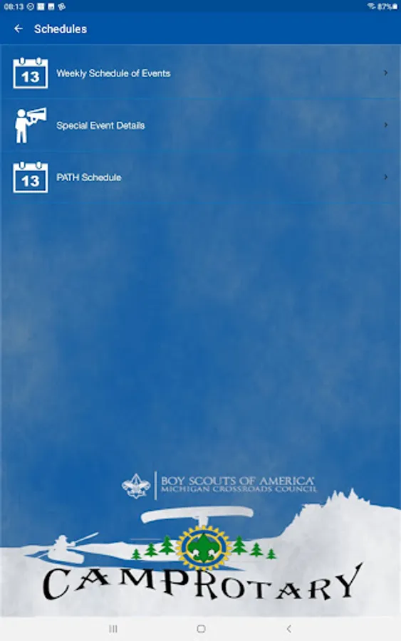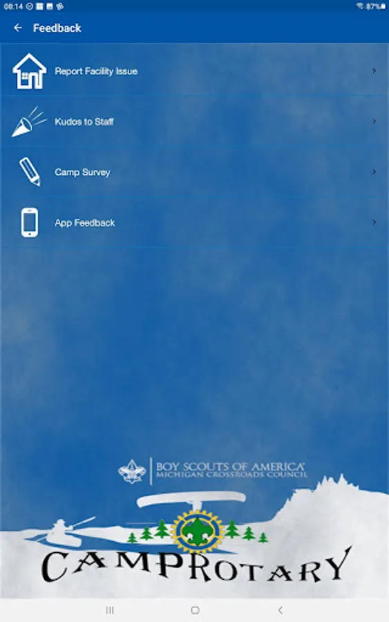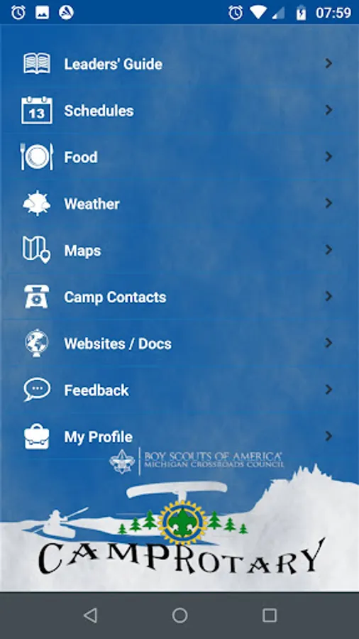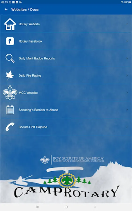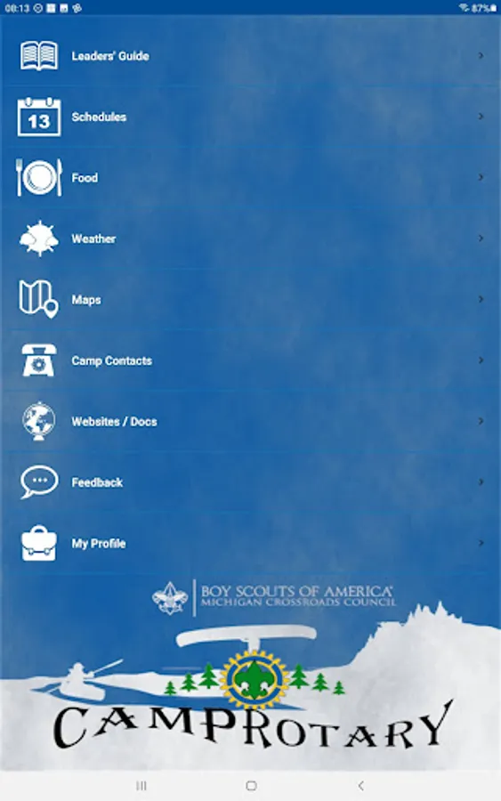 This Michigan Crossroads Council Camp App is provided as a service to participants on site at our camp facilities. Designed as an additional method of communication to unit leaders, this App is a supplement, not a replacement, for the forms, webinars, and other sources of camp information. This App is not meant to replace direct communication with MCC staff when issues arise.
