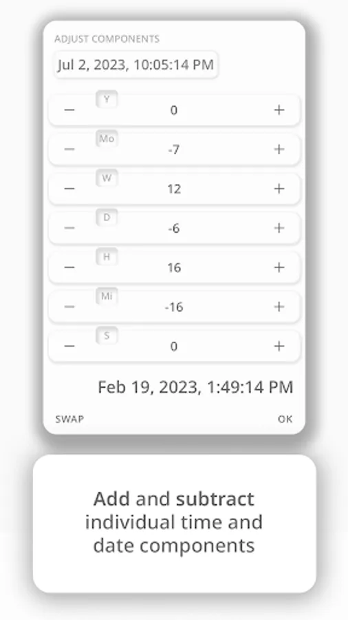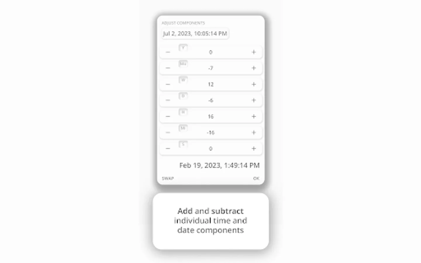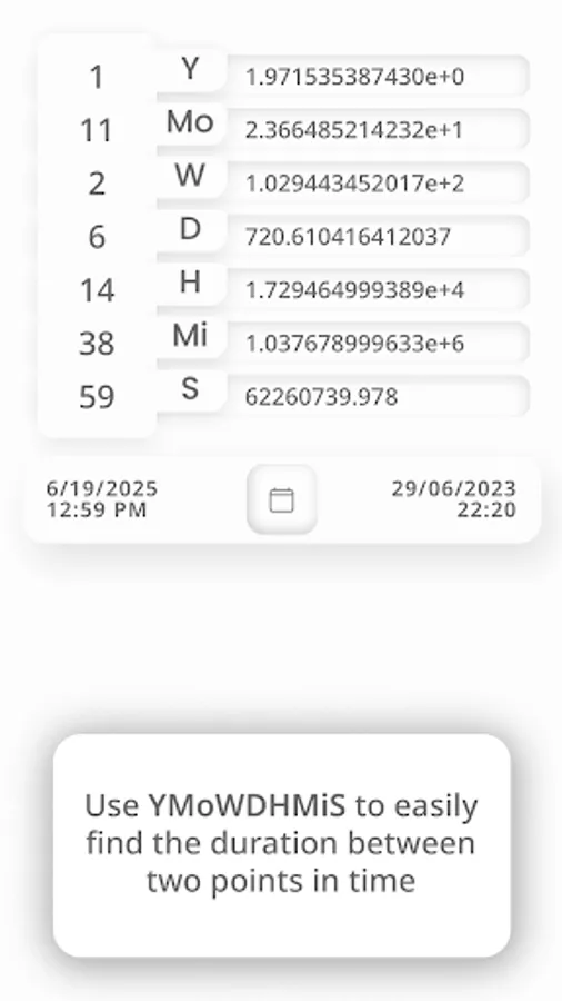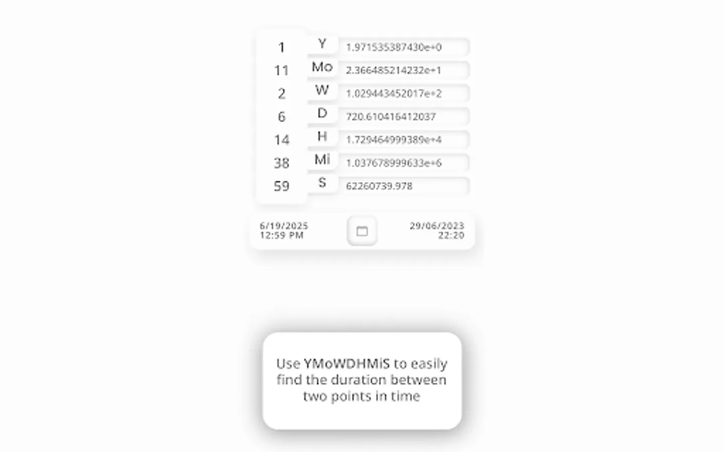 YMoWDHMiS is a versatile time calculator app that lets you calculate the difference between two points in time. It displays an aggregate amount of time, as well as the total in each time unit. You can also adjust the time units to see the resulting date and time.The app also stores a history of previously calculated dates, so you can easily reference them later.