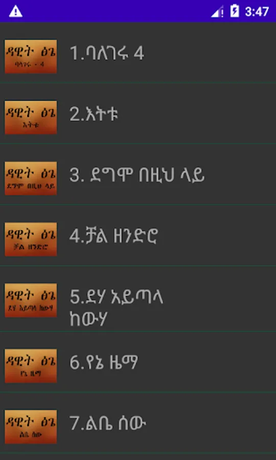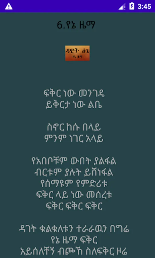 The App contains all the lyrics of Dawit Tisge's songs from Yene Zema Album
