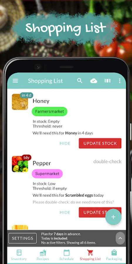 ✓ Automatic shopping list - based on your inventory and on the planned recipes your shopping list will be created automatically.