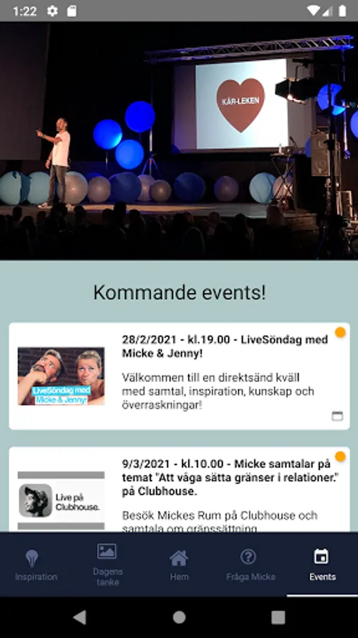Events calendar: Here you can continuously see Micke's various events that take place both digitally and physically around the country. Exclusive events are also presented here only for those of you who subscribe to the app.