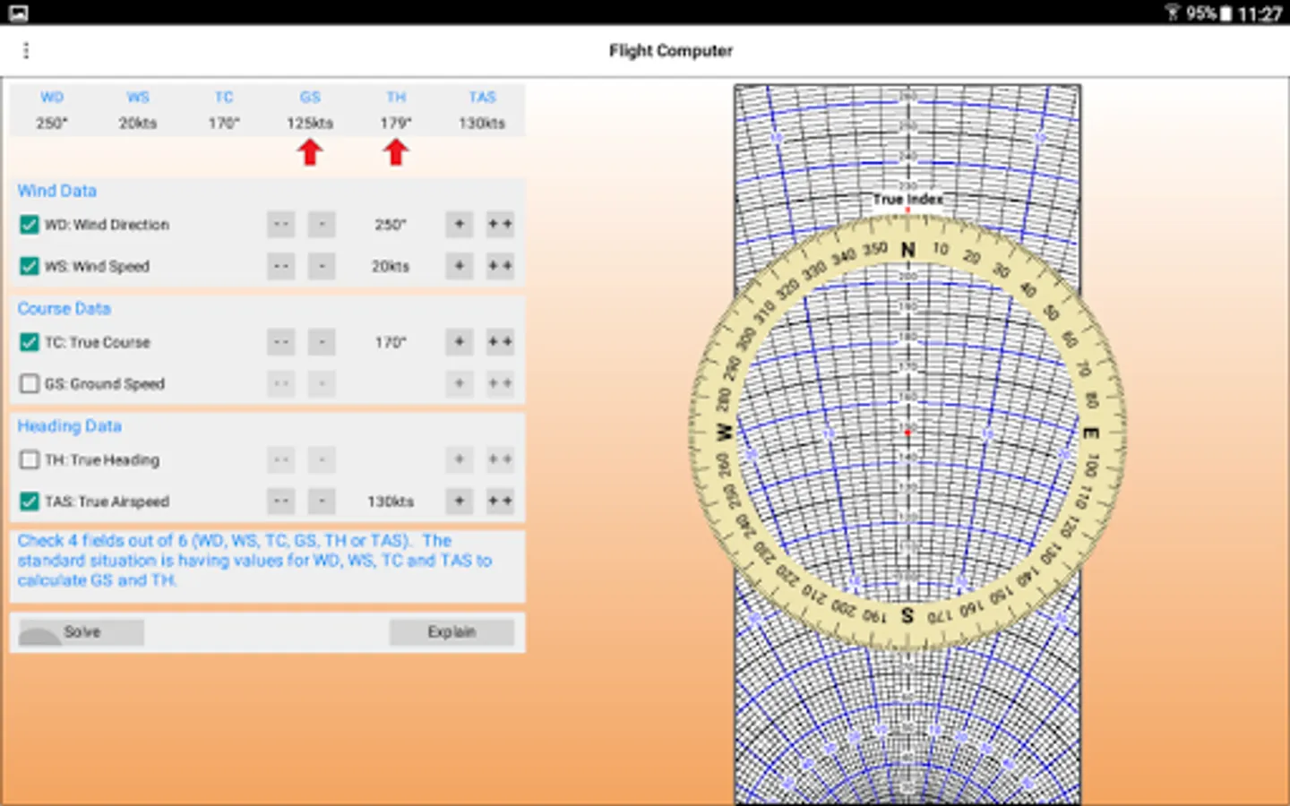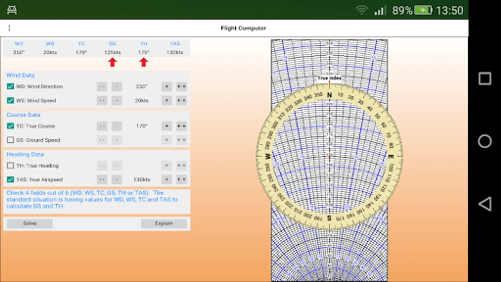 This app solves a wind triangle by allowing you entering four values out of six (three speeds and three angles) and calculating the remaining two. It then explains how you get these results with a flight computer, by animating it. It rotates the disk, slides it and add marks. It also shows what value to use for each step towards the solution.