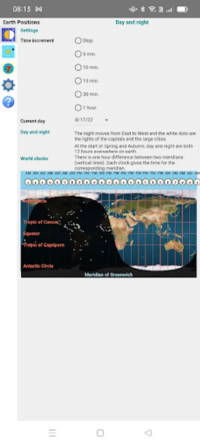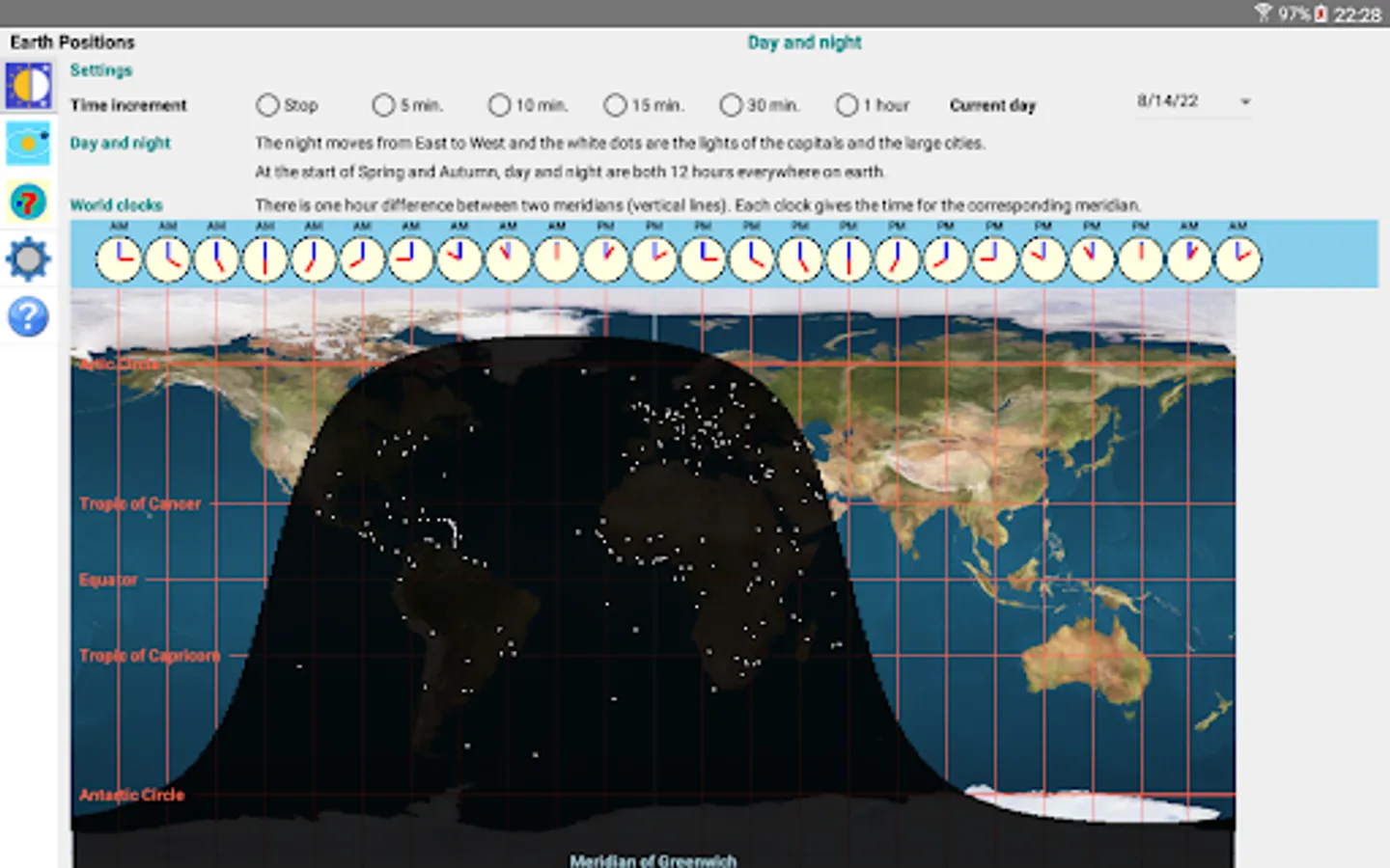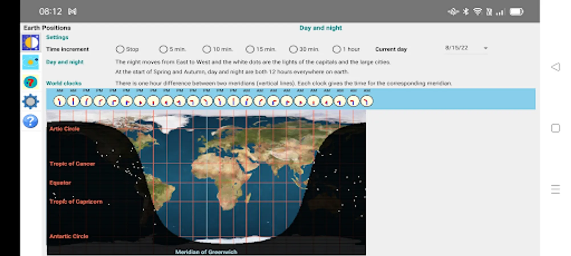 This is the screen when you start the app. It shows a moving shape of the night zone over the Earth map, the time at different Earth positions and the city lights of the capitals or some large cities at night.