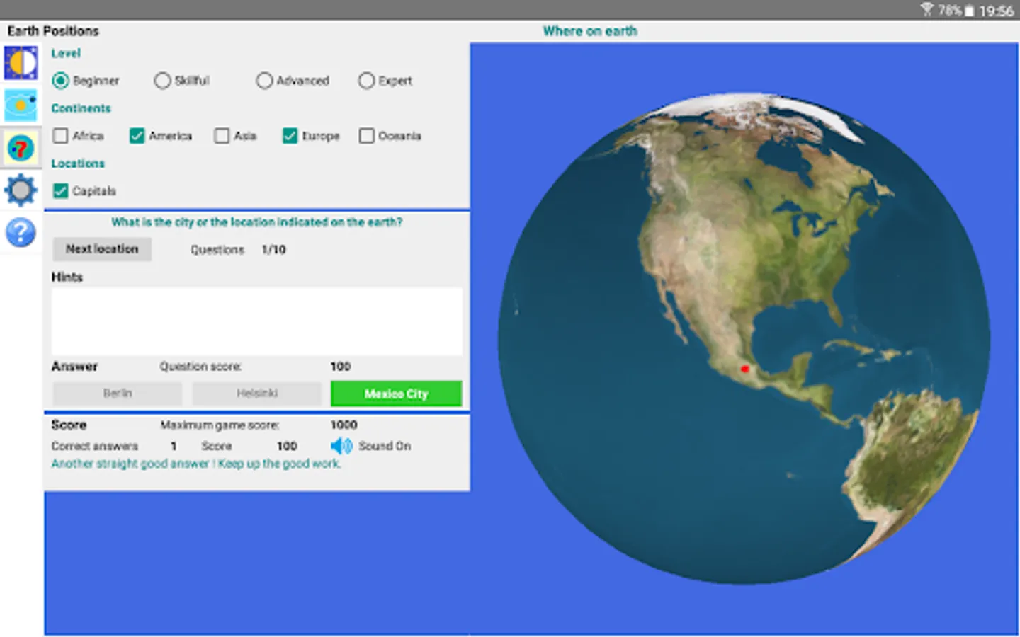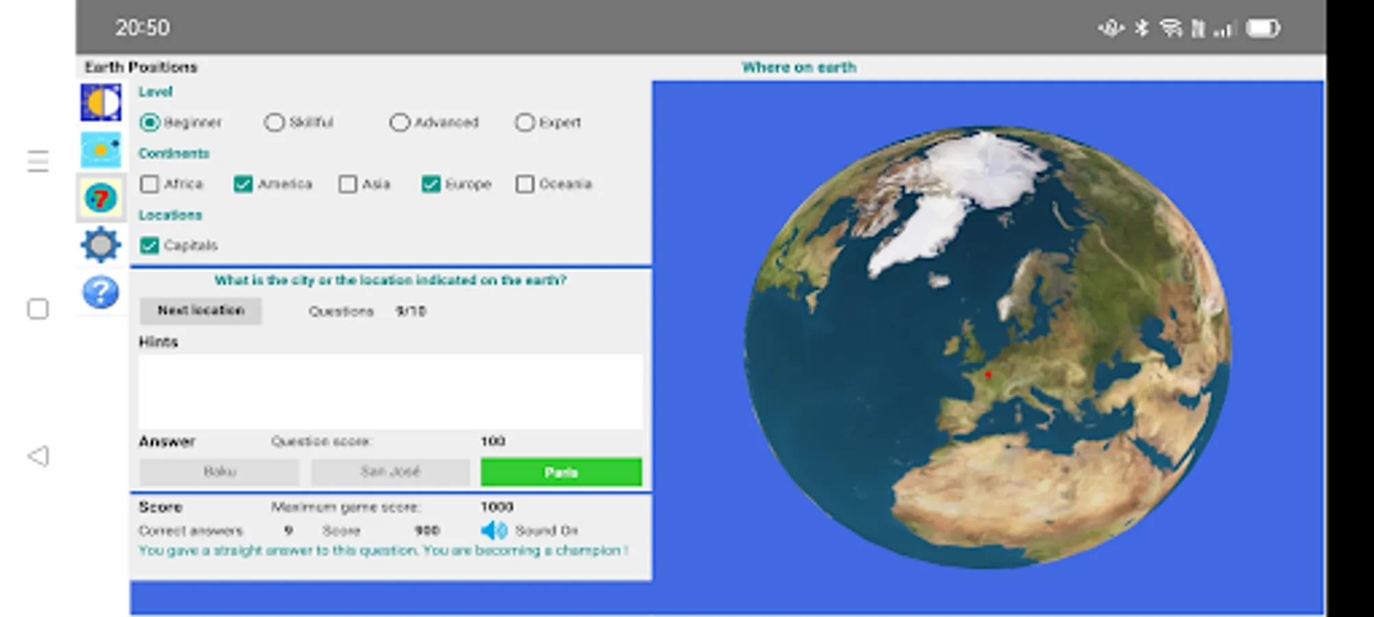 - Contains an addictive geographical game to guess capitals and cities, given a position on Earth.