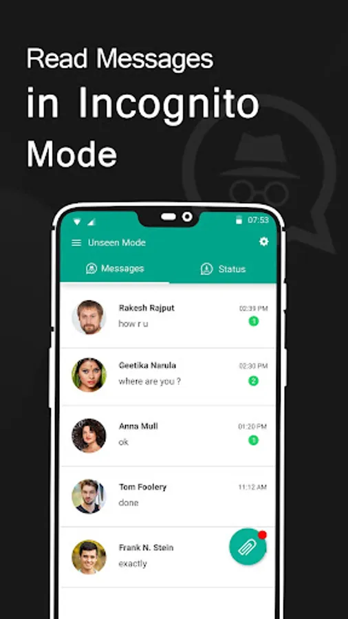 Unseen - Incognito Chat Read acts as a hidden or incognito mode to read WA messages. With the Unseen - Incognito Chat Read app, you can view messages & chat in complete secrecy without worrying about read receipts, blue tick, or last seen. You don't have to switch OFF your internet connection or be offline to read friends messages & chat.