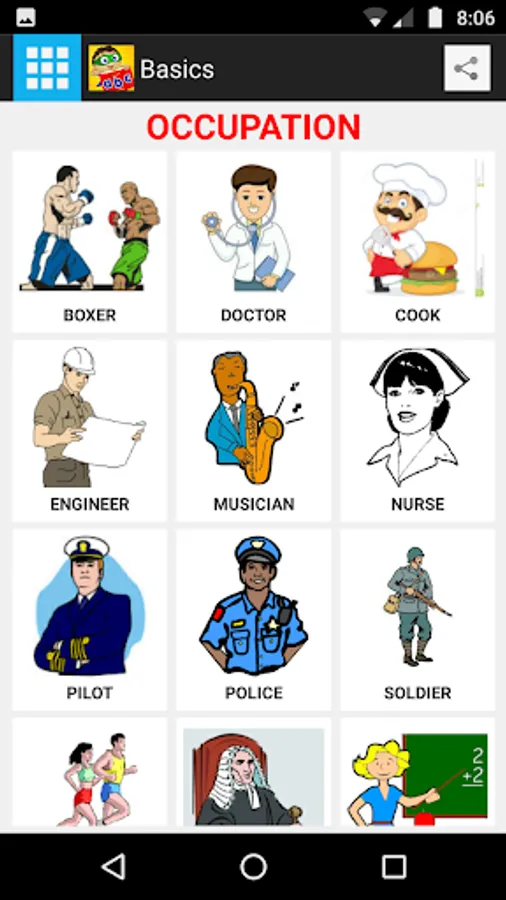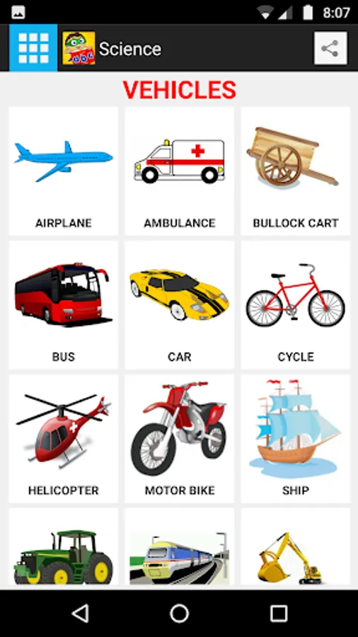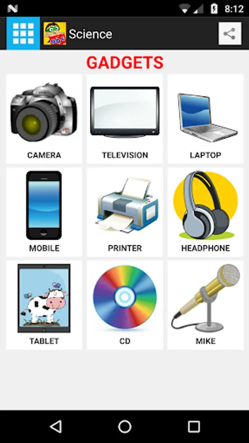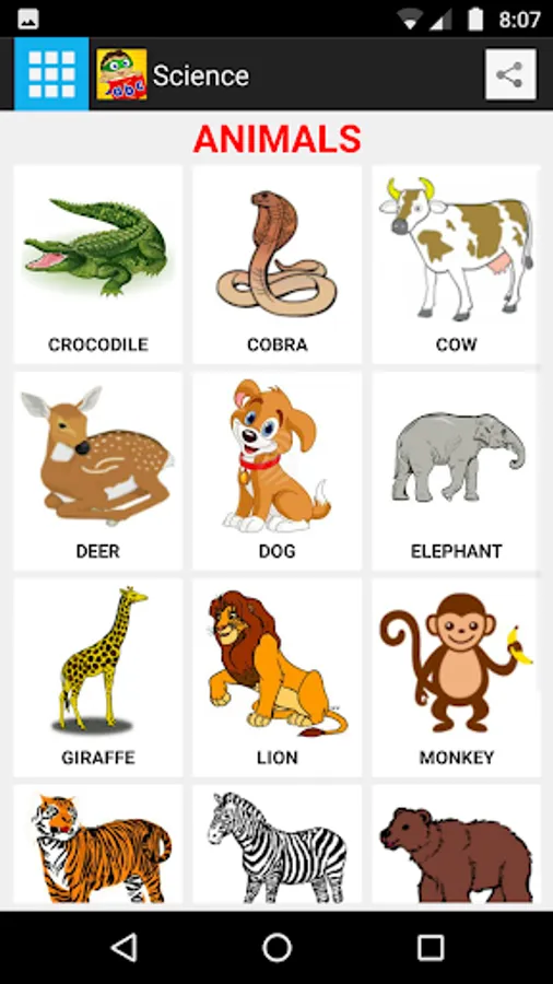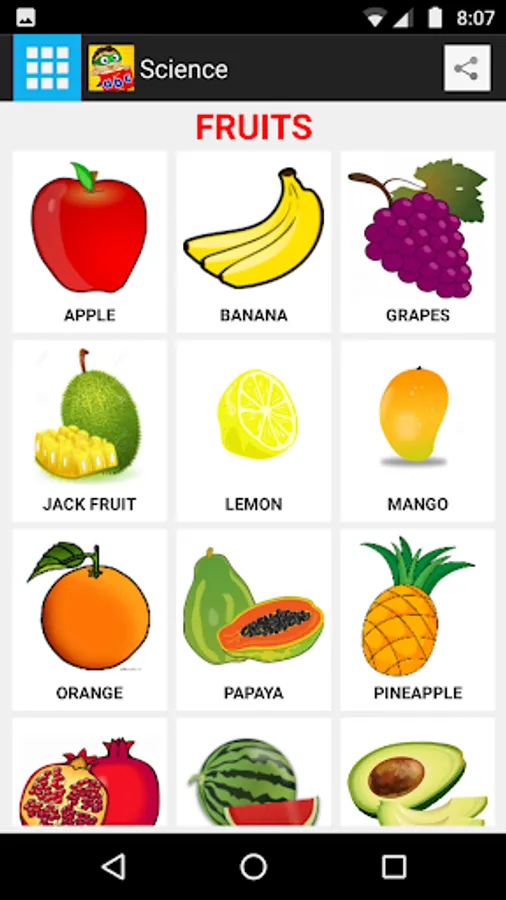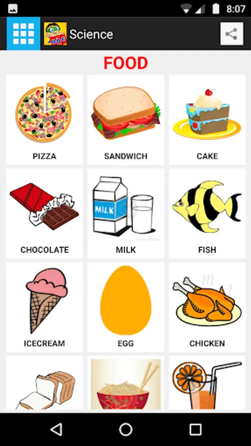 AUDIO/SOUND FEATURE in this app: When you touch on any icon it will pronounce/SPEAK the name like APPLE,PARROT etc.