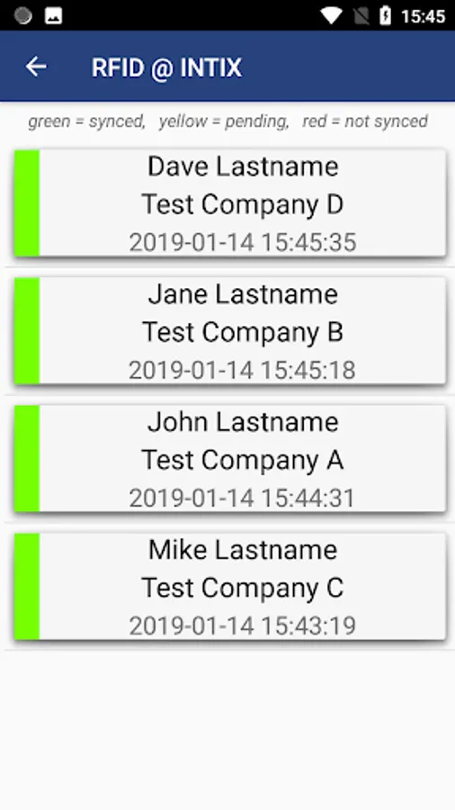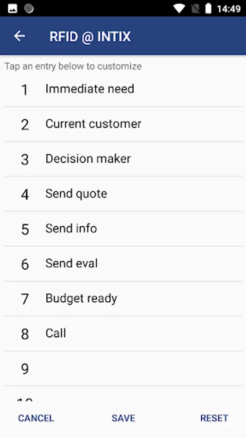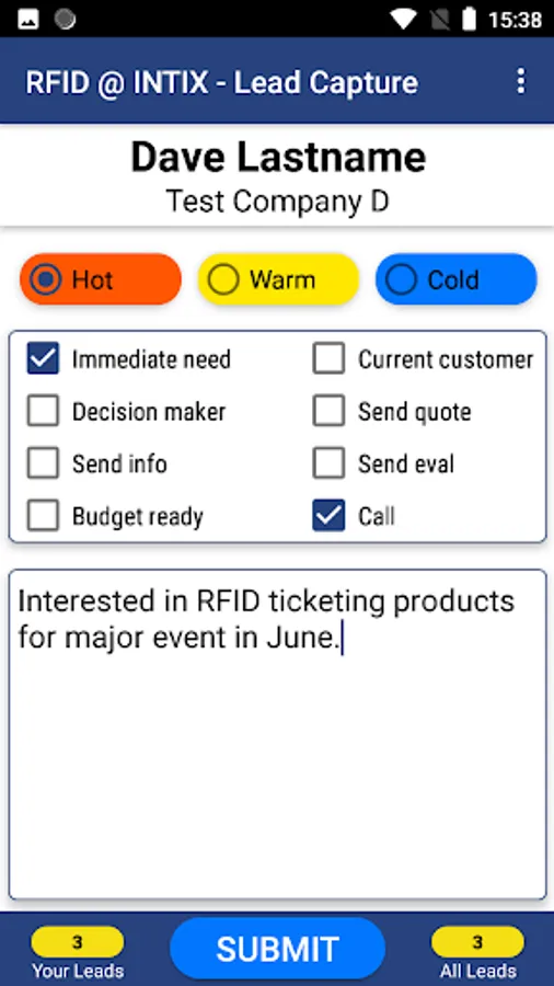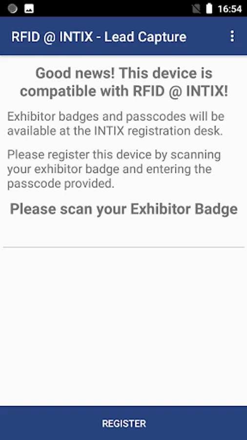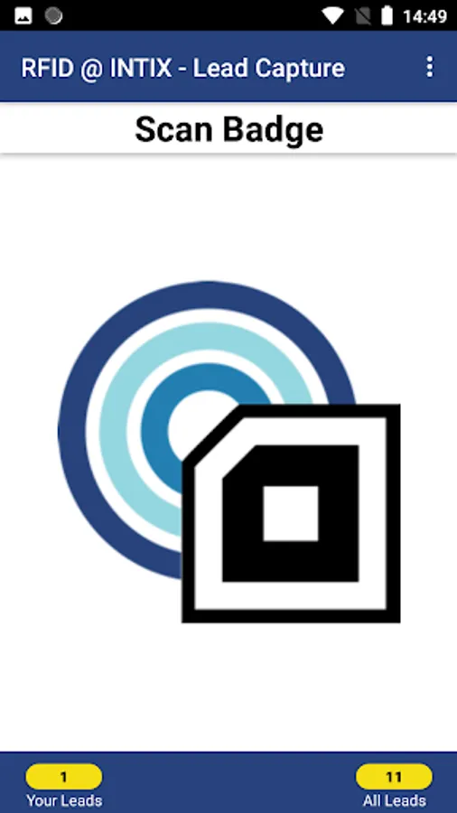 By using NFC capable phones, exhibitors can scan the radio-frequency identification tags embedded in INTIX trade show name badges. The RFID tags in the name badges are encoded with an identification number and the information printed on the face of the badge. The tags do not contain any additional personal information. When an attendee allows their name badge to be scanned, the RFID @ INTIX app will collect the attendee badge information and allow the exhibitor to record interaction details by entering notes and/or selecting from customizable quick key tags. The collected information is available locally for edit and review and securely synchronized to the cloud where it is combined with opted-in attendee supplied registration data for secure retrieval by the specific exhibitor that recorded the interaction. A continuous internet connection in not required to collect and edit lead data. The number of leads collected is displayed in the lower left hand corner. Multiple users in the same organization can use the same registration tag to combine lead data and view group totals. Badges and registration tags are available at the INTIX registration desk.