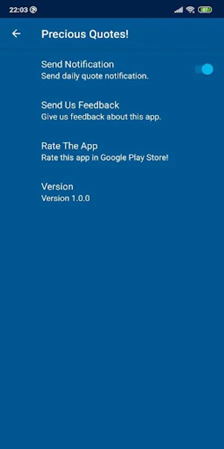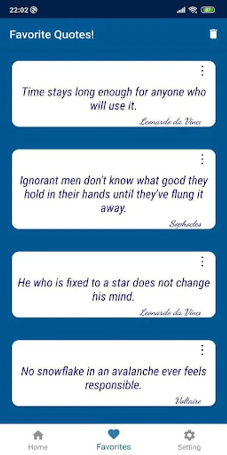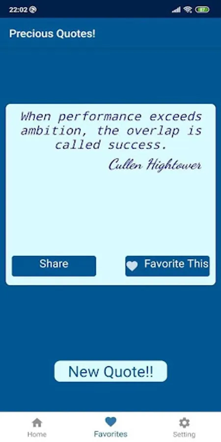 Click the new quote button to get a new one. Click the favorite button the add liked quotes to your own database. Click the share button to share the quote you like with your loved ones. Enable the daily notification and get your favorite quotes as a daily notification.