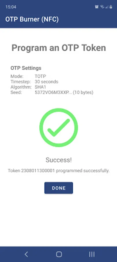 The OTP Burner app from Microcosm allows you to reprogram OTP cards and tokens with new settings including seed (secret key) and timestep values. You can burn a new secret key directly by scanning a QR Code or you can configure the settings manually.