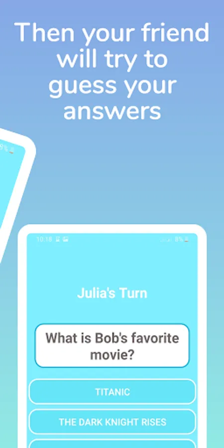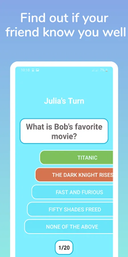 The test divided into two parts: the first part is for you, you will be able to answer 20 questions about your personality and the second part is for your friend or your partner and He/She will try to guess your answers and in the end, you will be able to see your result by percent and how well your friend/partner knows you.