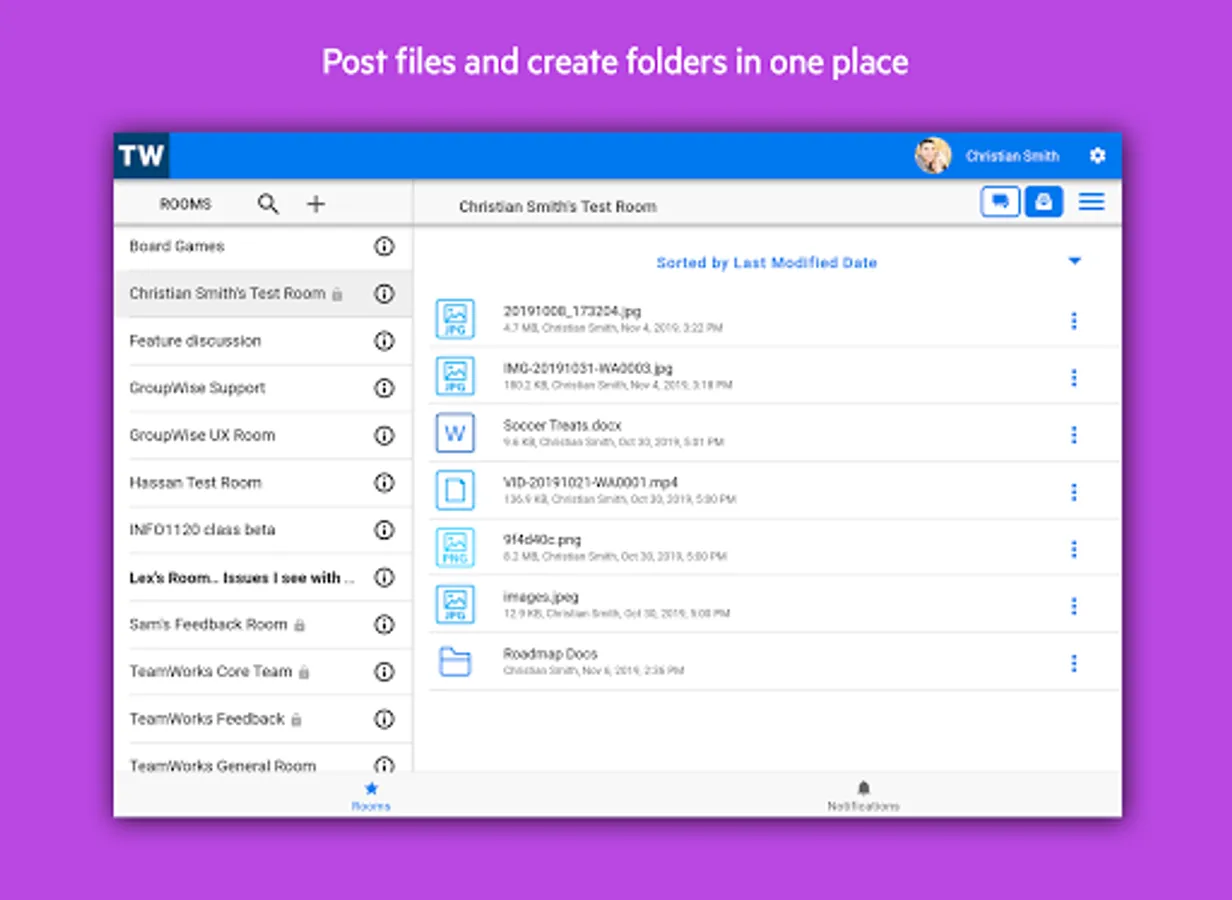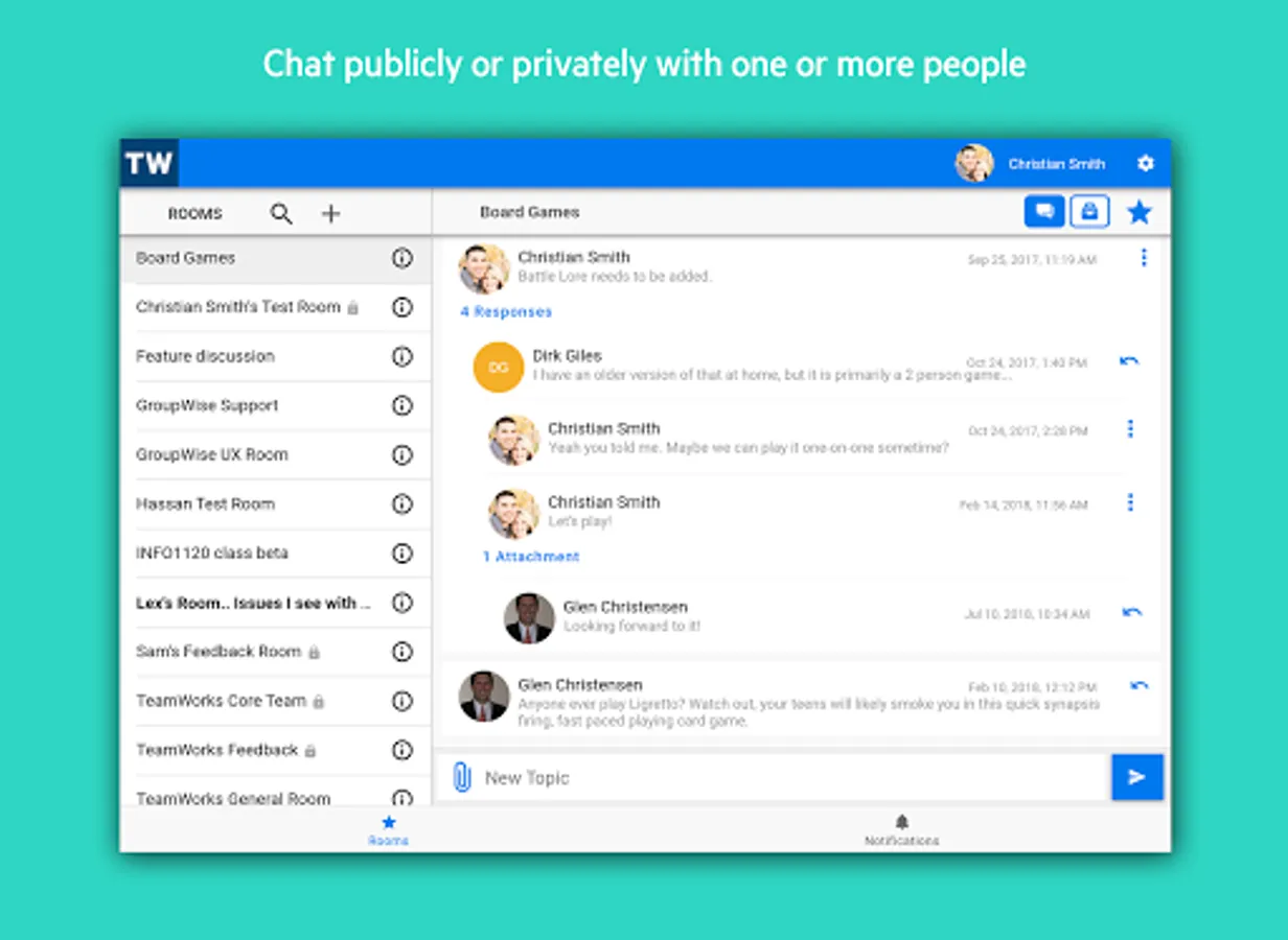 Micro Focus GroupWise TeamWorks helps your teams communicate and work better together. Engage in topic-driven, project-based, or team-oriented discussions with interactive, real-time conversations and dynamic file sharing. With Micro Focus GroupWise TeamWorks, you can communicate in real time through chat, share files, and communicate about changes on projects. You can access your conversations and shared files through your mobile phone, web browser, and Micro Focus GroupWise email client.