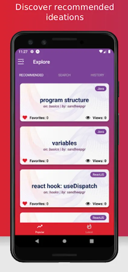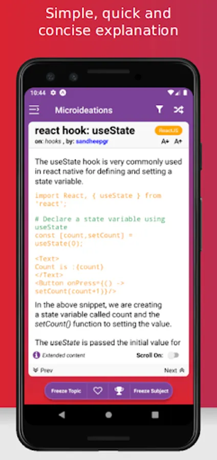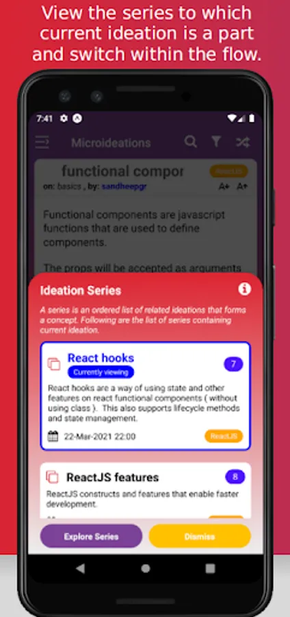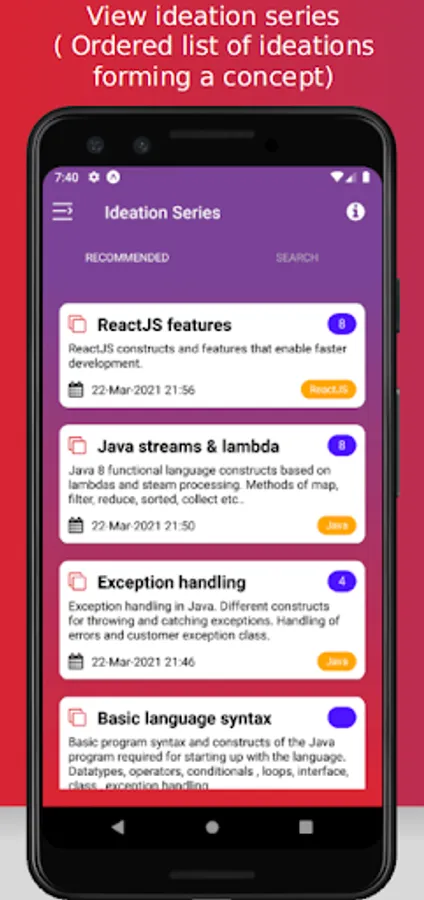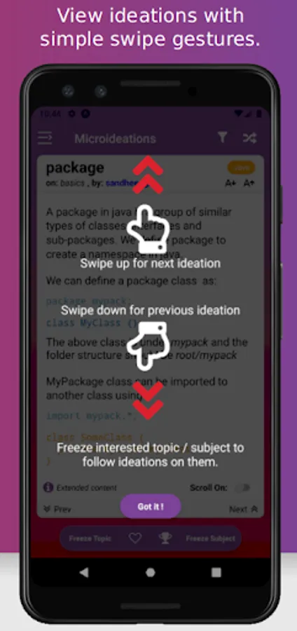 Microideation app redefines the learning experience by presenting the explanation for topics as ideations. A microideation (or ideation ) is a concrete explanation of a topic within 500 characters created by subject-matter-experts on the field using rich formatting and images. You can navigate the ideations using simple swipe gestures and each swipe brings up a new unseen content based on preferences. This allows for the continuous discovery of relevant ideations irrespective of whether you are on a metro train heading home or while having a peaceful cup of morning coffee.