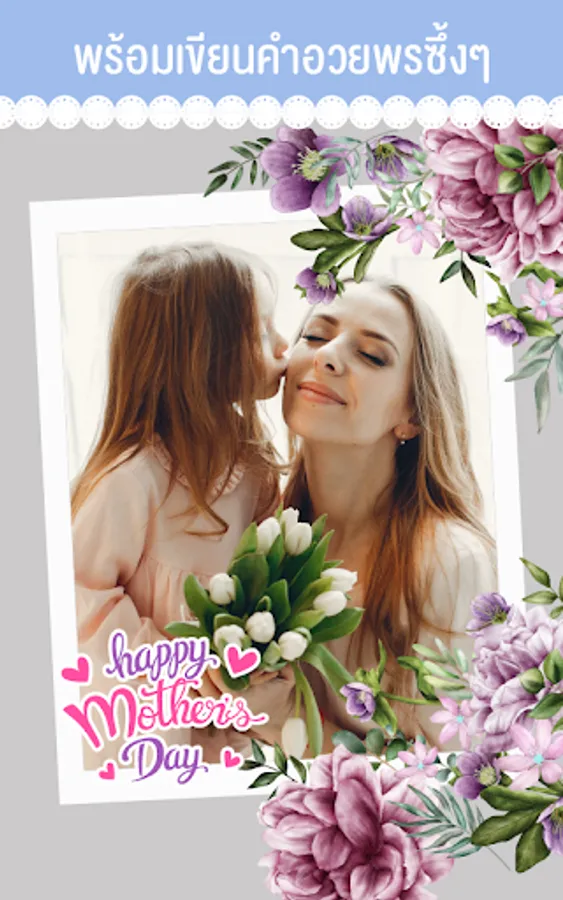 Start downloading the application. And can be used straight away Which can take pictures From a mobile camera Or to select images from the image gallery Can be modified Can move the image to the left, right, top, bottom and adjust the image to match with Happy Mother's Day Photo Frame. Can also set as Wallpaper immediately Have fun with use.