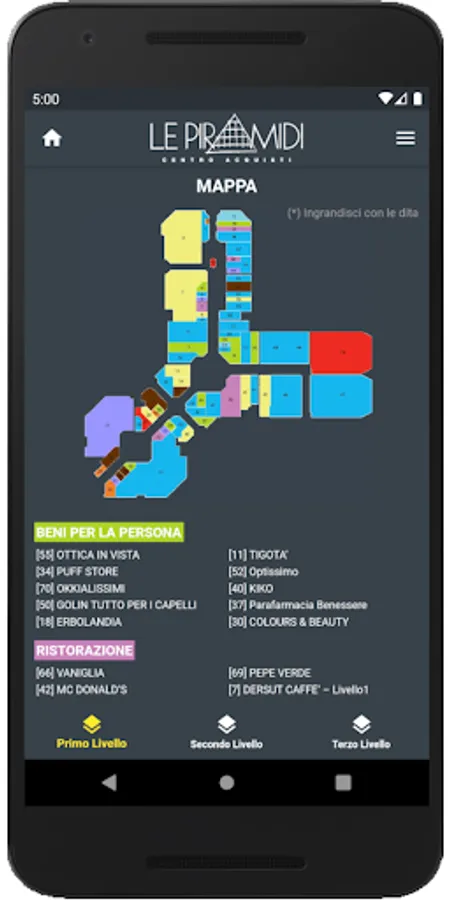 It displays the data of the center, the list of shops, events, current promotions and the map of the center divided by levels.