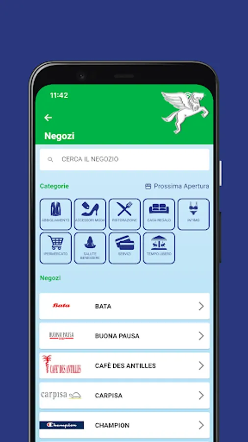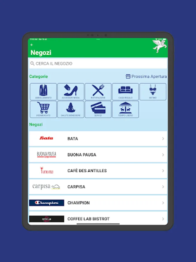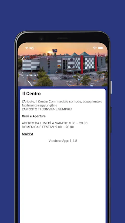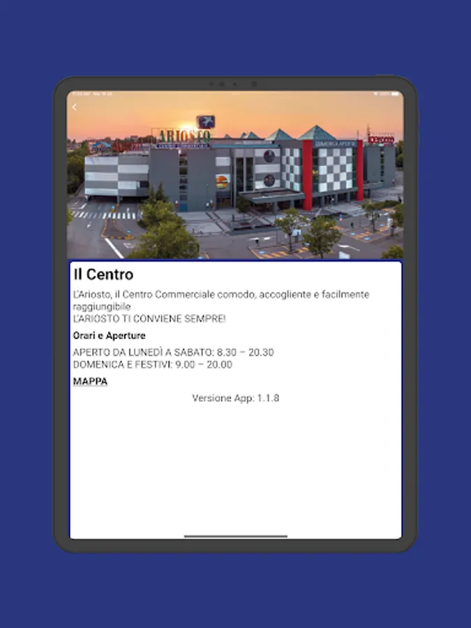 It displays the data of the center, the list of shops, events and promotions in progress.