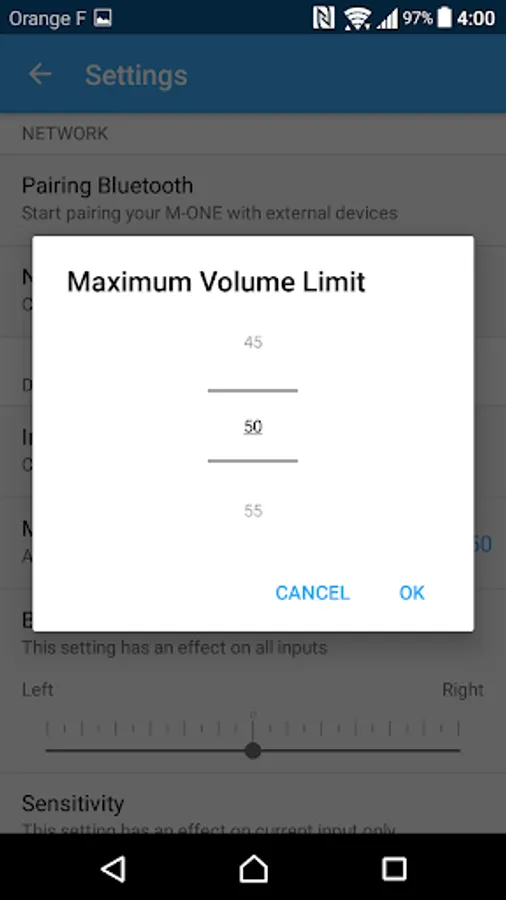By default, maximum volume is limited at 35. You can set a higher maximum volume in the "Setting" of the app.