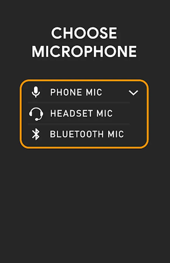 - Microphone Selection: Phone mic, Headset mic, Bluetooth mic.