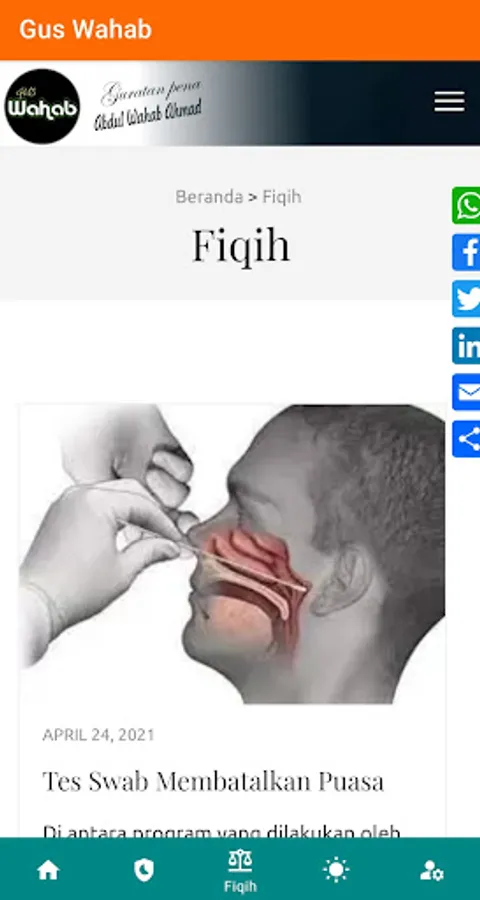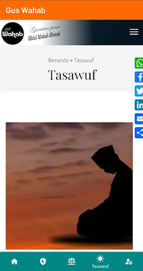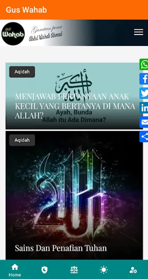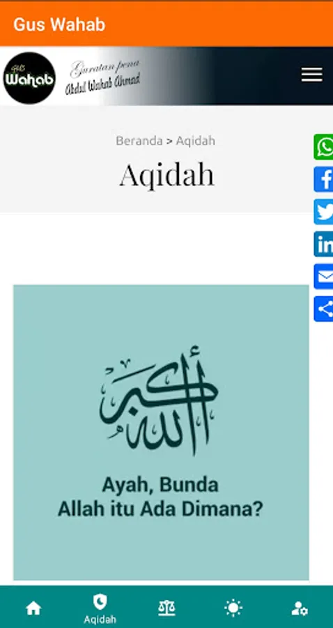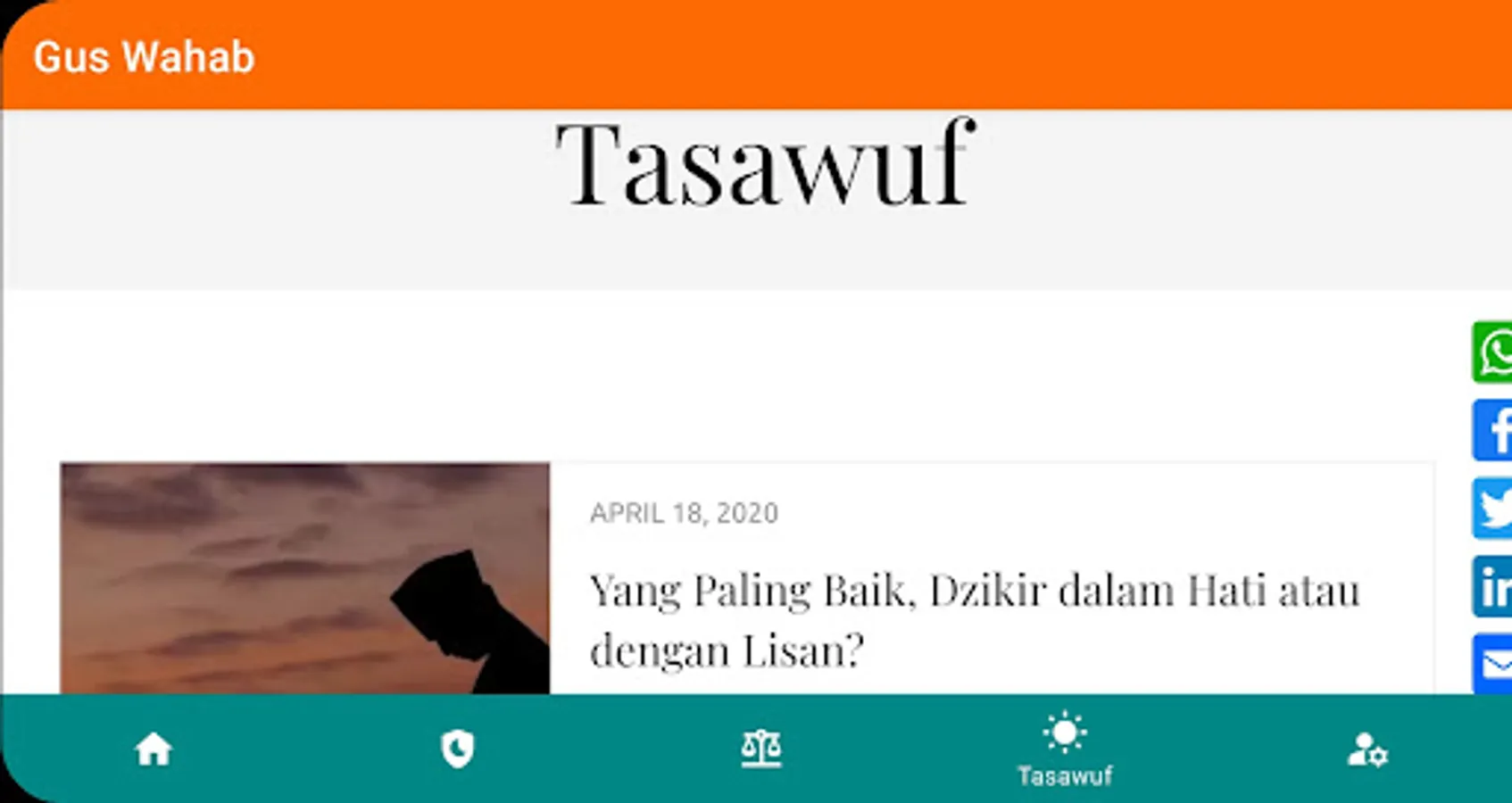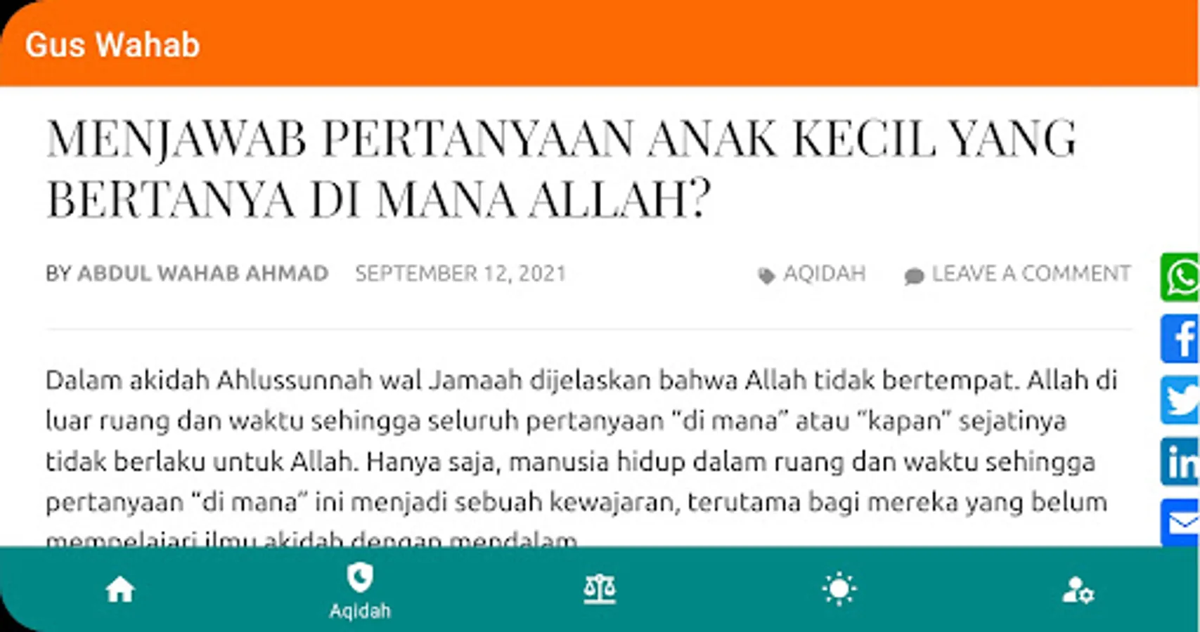 Applications that discuss Aqidah, Fiqh and Millennial Sufism. This application is the android version of the official website of Gus Abdul Wahab Ahmad, a researcher at the Aswaja NU Center in East Java. At the same time, IAIN Jember lecturer who is familiarly called as Gus Wahab. He is also a young writer who is concerned in the fields of kalam and fiqh. His writings are widely published on NU Online and spread on social media, especially Facebook.