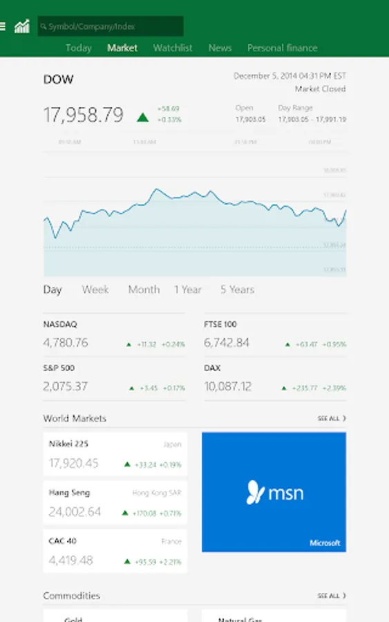 Track major indexes from around the world, including NASDAQ, NYSE, Dow Jones, S&P 500, DAX, FTSE 100, NIKKEI 225 and more. Also track currency exchange rates and commodity prices.