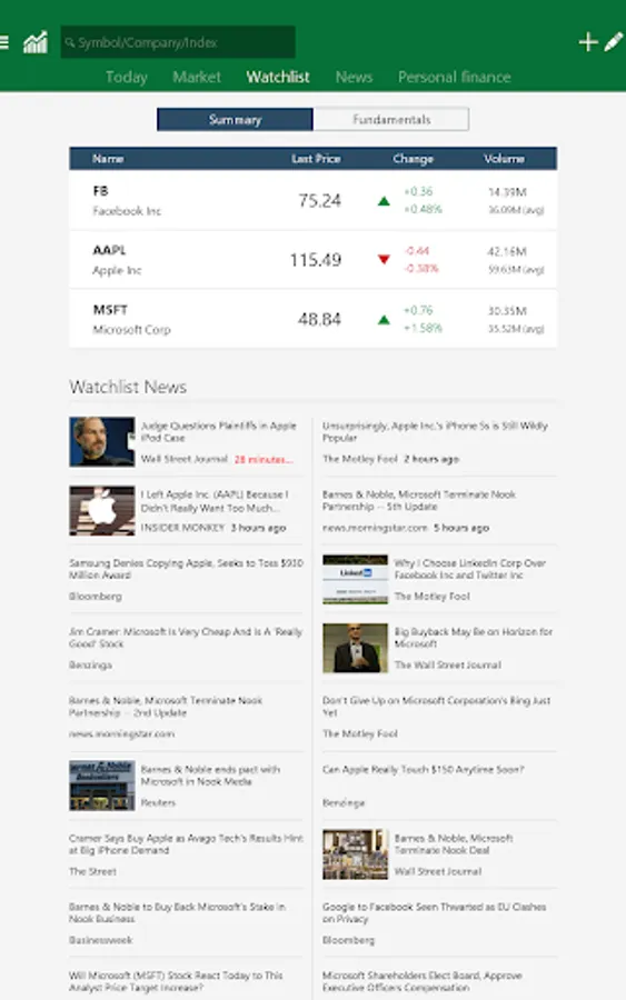Track Microsoft (MSFT), Google (GOOG/GOOGL), Nokia (NOK), Facebook (FB), Apple (AAPL), Twitter (TWTR), Alibaba (BABA), and more.