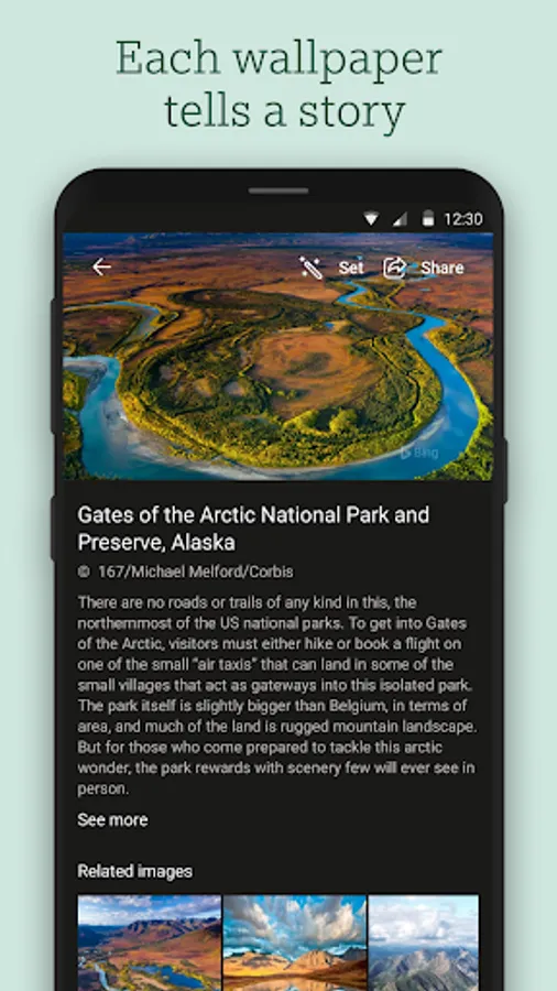 Bing Wallpapers features a collection of beautiful images featured on the Bing homepage over the last 10 years. Browse images, learn where they're from, and set them as your mobile wallpaper.