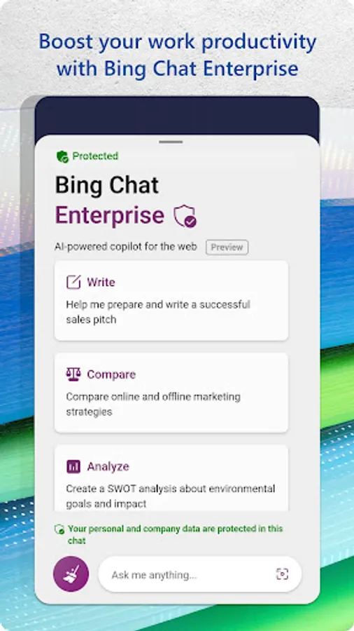 • Boost your work productivity with Bing Chat Enterprise*, your AI-powered chat with commercial data protection