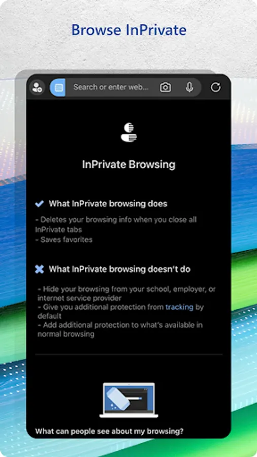 Protect your privacy and stay secure online with Microsoft Edge’s security tools. Stay safe and protect what matters with tracking prevention, AdBlock, InPrivate browsing, and InPrivate search tools. Use our built-in private browser to help keep your browsing history safer and protect your privacy online.