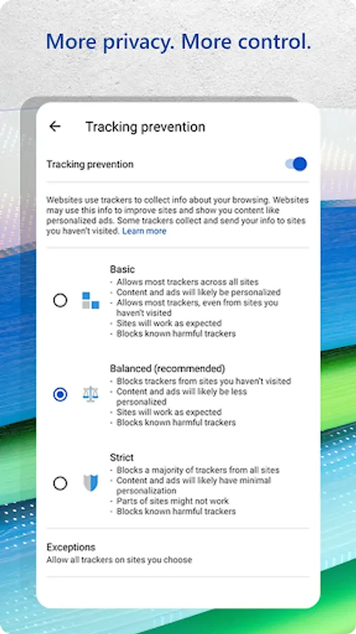 • Tracking prevention is enabled by default, so you don’t have to take any action to start having a more private browsing experience.