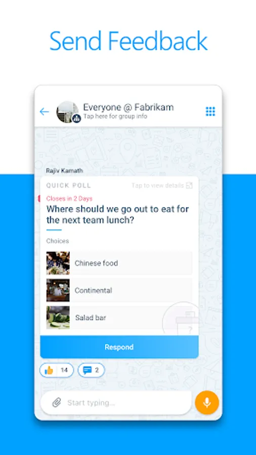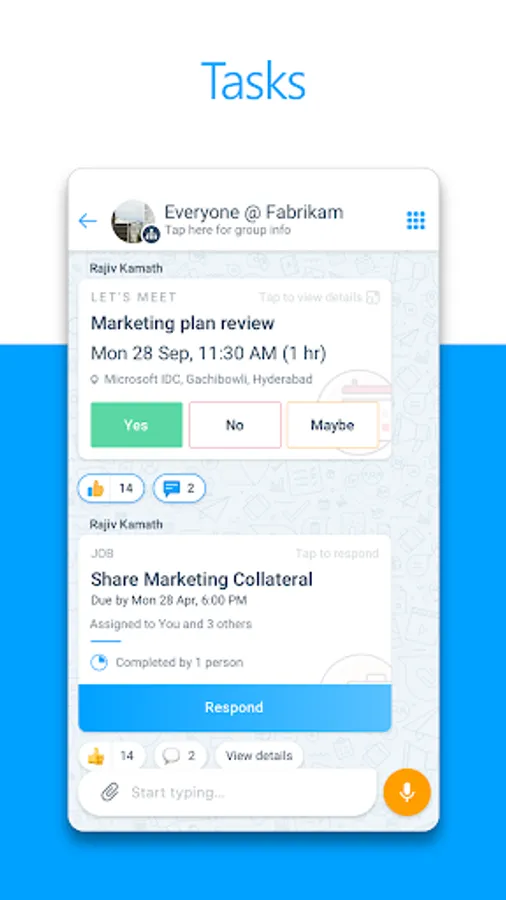 Kaizala is a highly interactive, all-in-one messaging app with incredibly productive & utility features viz. announcements, task management, survey & polls, schedule meetings, collecting feedback, requesting attendance, quizzes, and more.