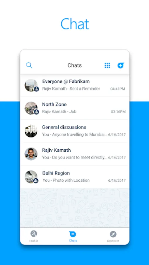 Kaizala provides secure 1:1 and private group chats. These can be groups for internal team discussion, engaging consumers and gather feedback, and for professional interaction and interest-based networking.