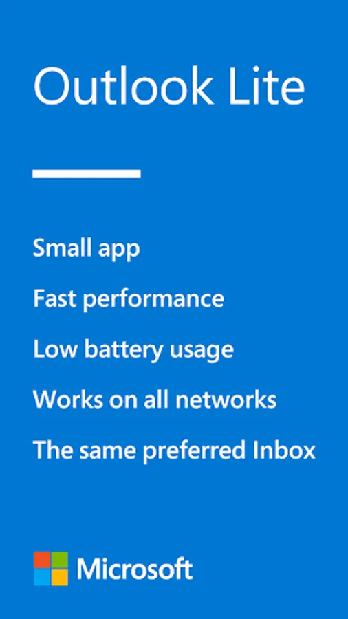 The ultimate email app, designed for your phone. Microsoft Outlook Lite helps you manage your inbox by bringing all your favorite email, calendar and contacts functionalities together. Enjoy enhanced performance and lightning speed with Microsoft Outlook Lite, now optimized for low-resource phones.