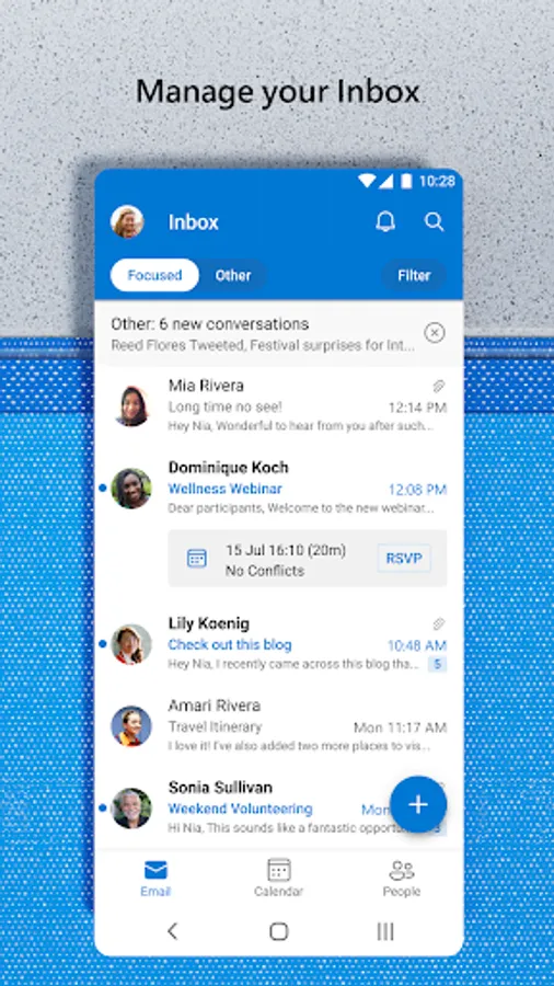 Manage your contacts, email, schedule & more with Outlook Lite.
