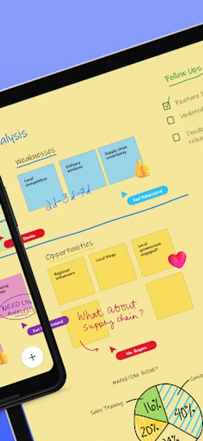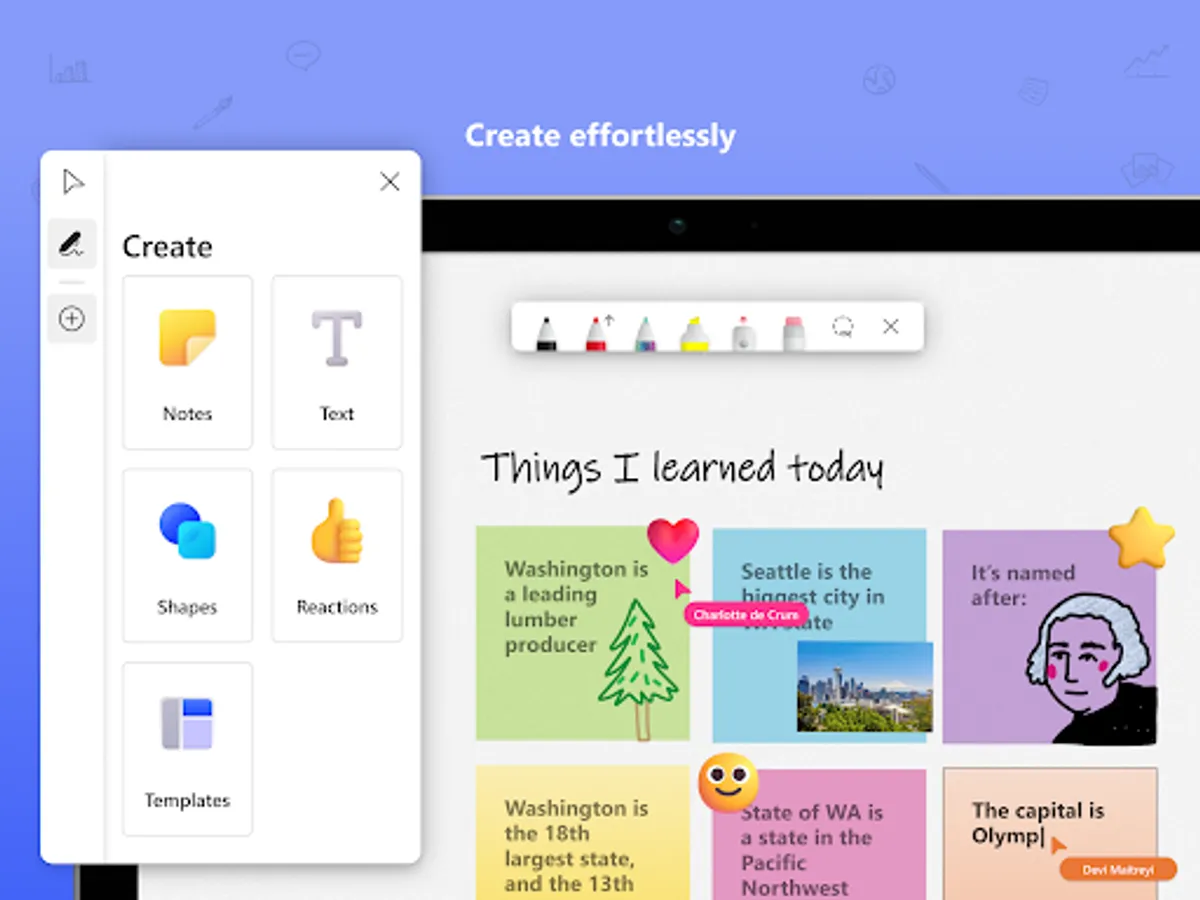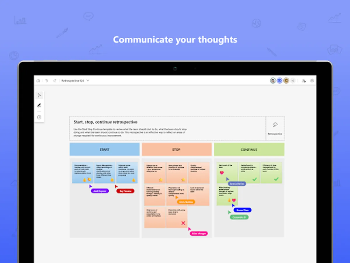Microsoft Whiteboard brings every member of a team together working from their own devices across the globe. On the Whiteboard canvas, you can also see what your teammates are doing in real time and start collaborating on the same area. It’s about getting everyone on the same page – or board.
