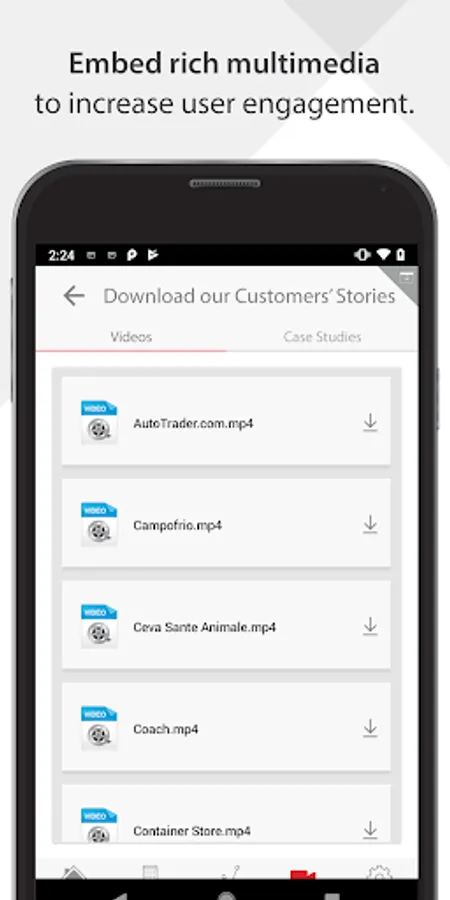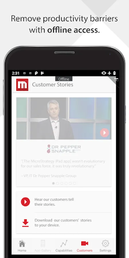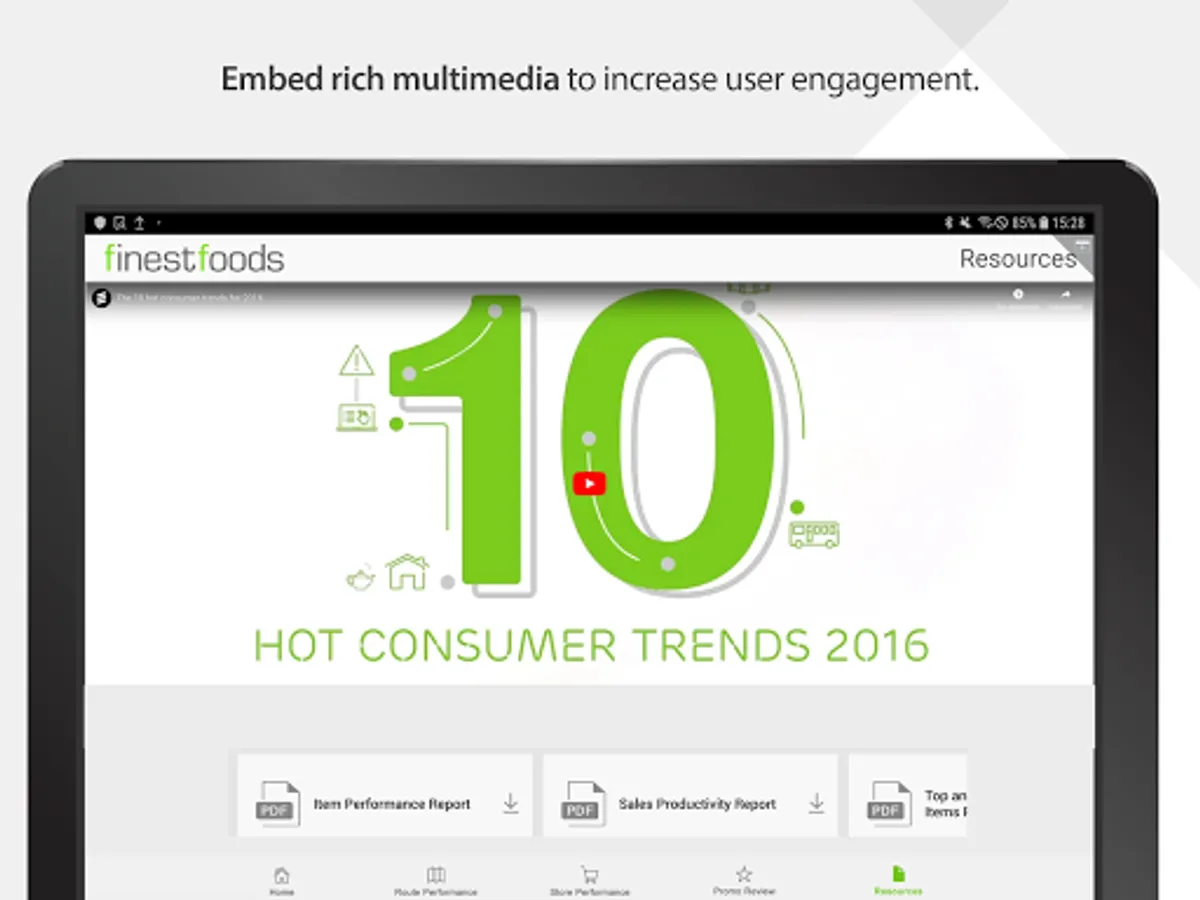 • MicroStrategy supports in-app viewing of multimedia content including videos, PDFs, images, presentations, spreadsheets, documents, email, and web content—all seamlessly embedded within a mobile app
