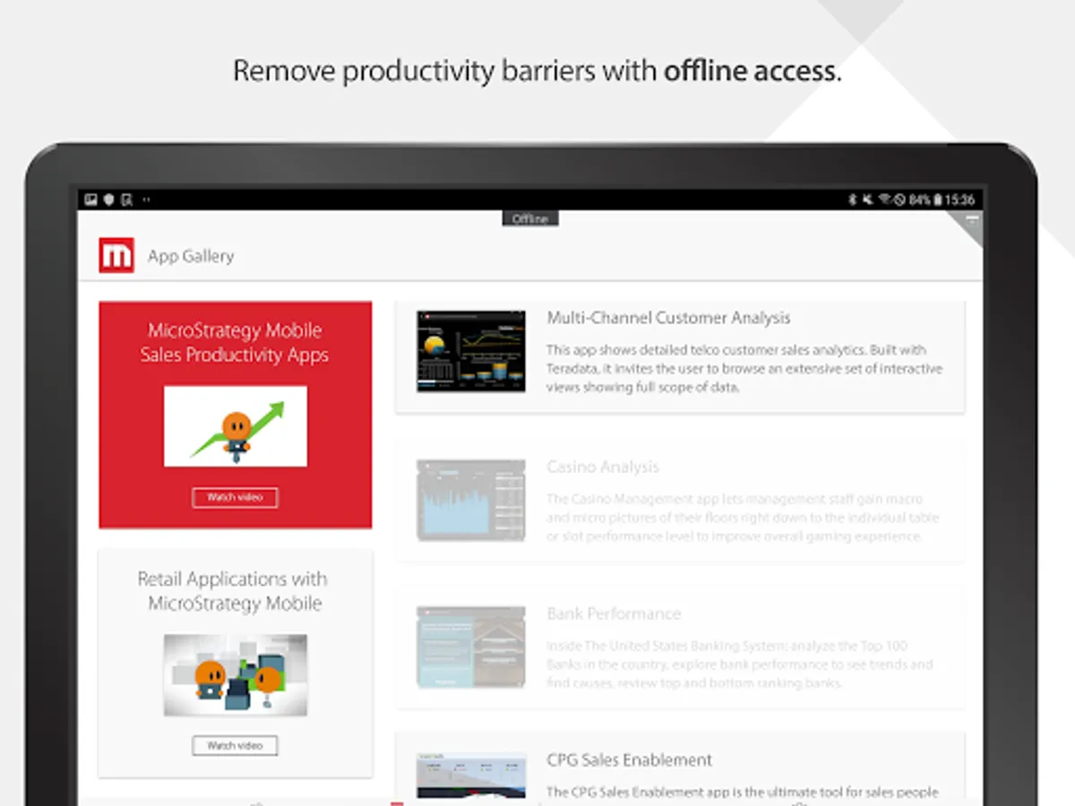 • With a vast library of native gateways and drivers, MicroStrategy mobile apps can easily access data from any enterprise resource, including databases, enterprise directories, cloud applications, and more.