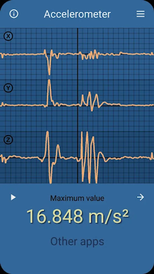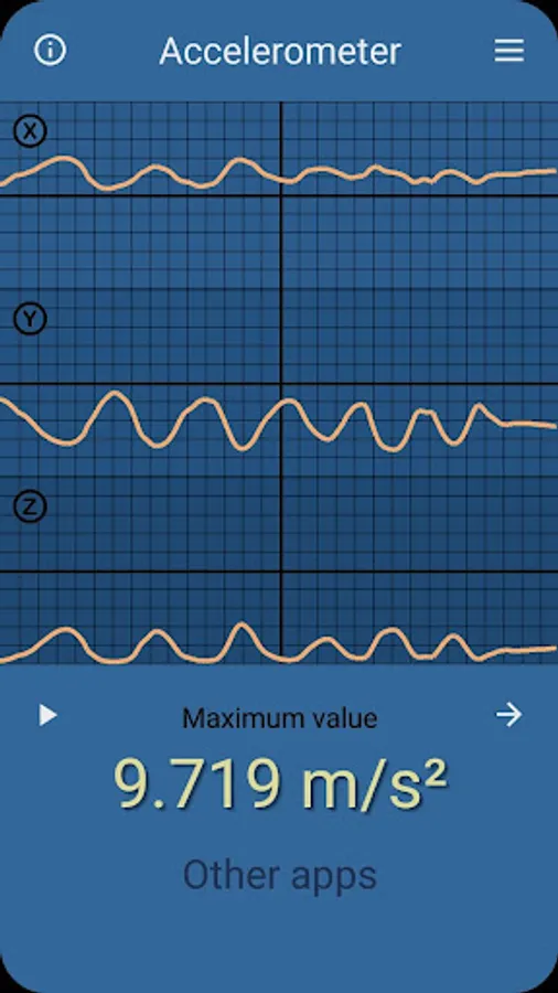 This simple and nice app displays a graph of Acceleration vs. Time on three axes. The three components of the acceleration vector are continuously read from the currently selected sensor; they can be displayed together, on a single grid, or each component can have a separate graph. Our app (portrait orientation, Android 5..8 required) will only work on the smartphones that have at least one acceleration related sensor, hardware or software. You can use the Accelerometer app to study the Earth's gravitational field or to measure the mobile device's movements and vibrations.