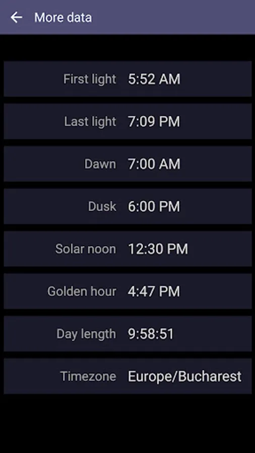 This easy-to-use app accurately computes the sunrise and sunset times based on your current location and current day of the year. Also, it can show those solar times for yesterday and tomorrow if you tap the left or, respectively, right arrow buttons. Solaris works on tablets and smartphones connected to the Internet. At first, it gets the local coordinates (latitude and longitude) from your device's GPS and then retrieves the solar data from an Internet server. In addition to the time values we already mentioned, our app also reads the First and Last Light times, Dawn and Dusk moments, Solar Noon, Golden Hour, and Day Length and shows them when you tap the four-dots button.