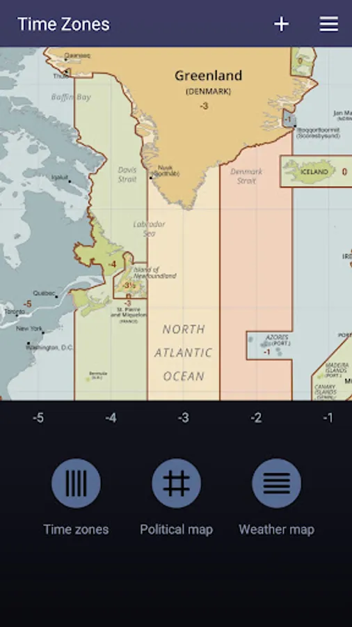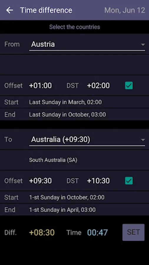 - The first page (tap the left button) hosts a high-resolution map of the entire globe, showing the shape of each time zone. You can pan, zoom-in or zoom-out, finding out the time offset for any region. Tap the '+' button to calculate the time difference between two countries; choose the first and the second country, then select the DST (Daylight Saving Time) checkboxes if applies. The new local time can be manually SET, this operation being very useful when the Internet and location services are not available.