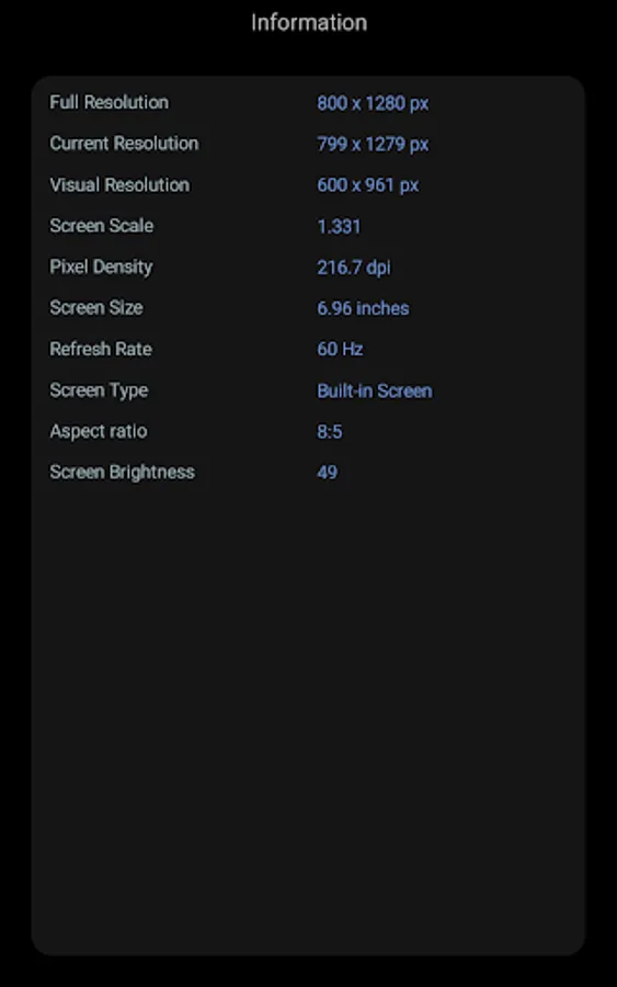 There are three color-related tests (purity, gradients and shades) and two touch-related ones (single and multi-touch). The Display info button opens a page that contains data about the screen resolution, pixel density, aspect ratio and current brightness. Depending on your phone model, these tests can help you decide, for example, if the eye comfort mode must be enabled to prevent eye strain, if the brightness level requires some adjustment or find out if the touch sensitivity is still good all over the screen's surface. The color tests and Information require one tap for every page. Anyway, you can exit anytime from the current test with a double-tap somewhere on the screen. The Single-touch test is complete when the whole screen is filled with blue rectangles - including the area occupied by the upper text message. If the touch screen proved to function properly, the Multi-touch test helps you check if several fingers (maximum ten) can be used simultaneously to make multi-finger gestures in your apps. Finally, two animation tests indicate the frame rate of your display (in Frames Per Second) while a cube or a few rectangles move all over the screen.