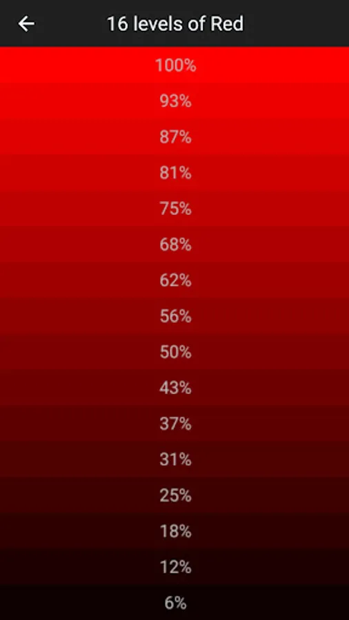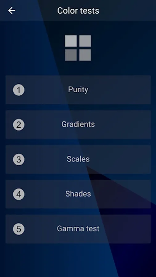 Color tests shows five more buttons, one for each color test available: Purity, Gradients, Scales, Shades, and Gamma test. These tests allow you to simply verify the uniformity of the main colors on the screen, the contrast they offer at the current level of brightness, and see how many of their shades may be identified. The gamma test displays a suite of color shades that allows you to find out the gamma value (it indicates how well the brightness level of your device reflects the input signal.