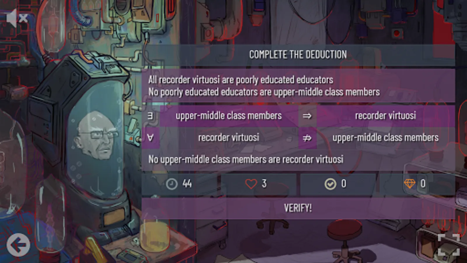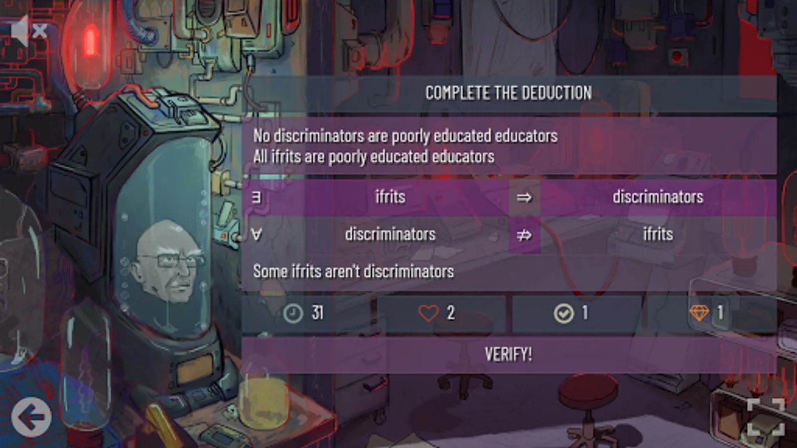 You're a brain in a vat that's being held in some dingy basement (yes, that's academy of sciences). They force you to evaluate deductions all day long. Are you persistent enough to win yourself freedom? Take part in a great logic competition. Prove that syllogistic is no mystery to you and you're worth to be called a son of Aristotle. Good luck!